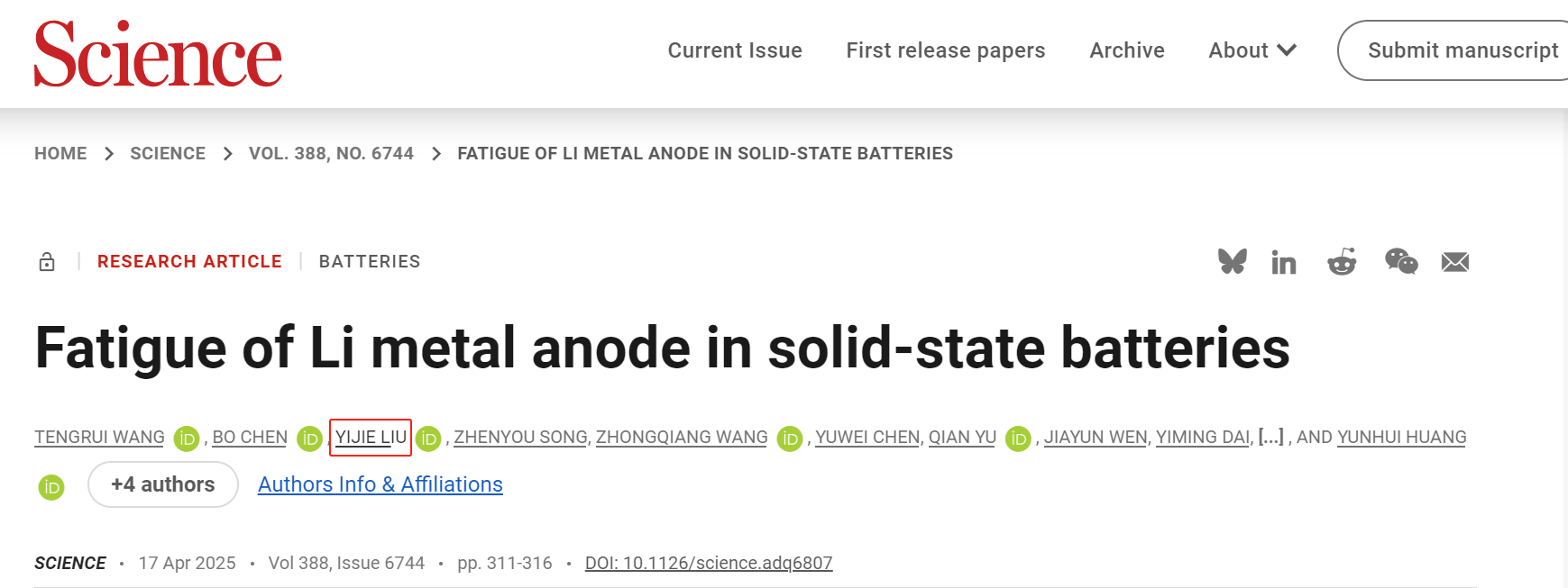 18 Apr 2025Assistant Professor Yijie Liu Published Papers in Science