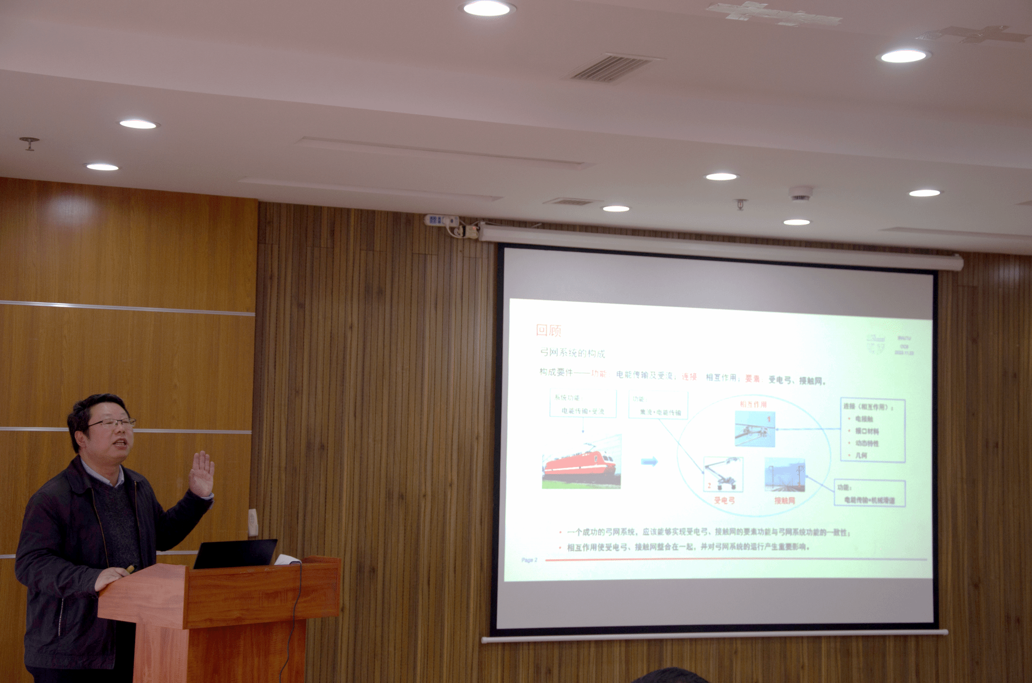 吴积钦教授以《弓网电接触》示范课为例,与在座教师分享了先进教学理念和教学技巧。例如,利用有趣的语言调节学生上课的气氛、联系生活巧妙解答疑难问题、图文结合提出问题、利用问题引出挑战性课题,这些都是十分巧妙的办法。吴积钦教授强调,青年教师应学会换位思考,充分考虑学生感受,适时提出思政教育。他从人才的问题引出人在学习中如何进步、人的目的性和谋生利益、知识与文化的区别等思考,进一步提出让人理解、为学生考虑、认知与思维的重要性。在最后的结语中提出有教无类、因材施教、教学相长等要点。