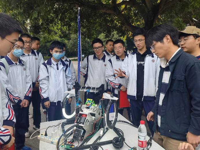 学院本科2019级学生金杰、方心、刘邦鸿,向同学们现场演示了解魔方机器人的工作,介绍了魔方机器人的原理、实现过程,该作品在2022年中国大学生智能机器人创意大赛中斩获国家级一等奖。同时也对同学们在课外科技活动中遇到的问题进行了解答,对交大学生科技活动开展情况进行了简要介绍。