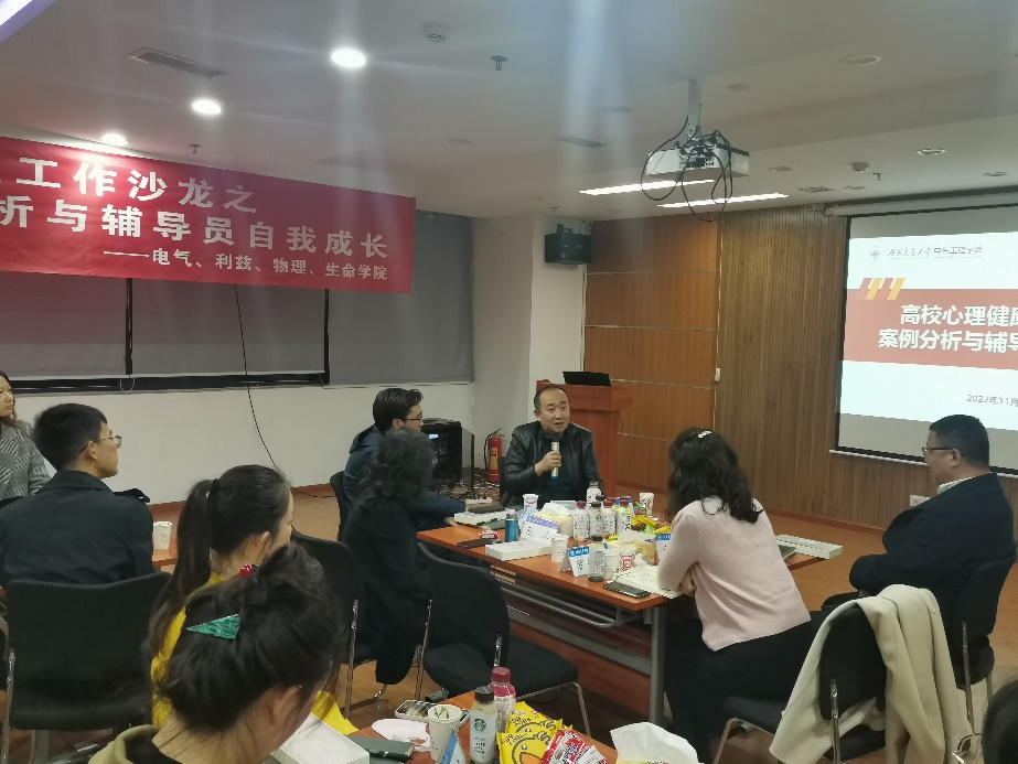 为切实加强辅导员队伍建设,及时分析、研判、解决大学生日常思想政治教育工作中面临的新形势、新问题,11月28日下午16时,由党委学生工作部主办,澳门十大电子正规游戏网站、生命科学与工程学院、物理科学与技术学院、利兹学院承办的第四期“知行”辅导员工作沙龙在电气馆10832举行,研讨高校心理健康教育工作案例分析与辅导员自我成长方面的问题。心理咨询中心主任陈华,电气学院党委书记罗乾超,学工部副部长邢晓鹏,生命学院党委副书记朱炜,物理学院党委副书记郭剑,电气学院党委副书记谢力,利兹、生命、物理、电气学院辅导员参与此次工作沙龙。活动由澳门十大电子正规游戏网站党委副书记谢力主持。