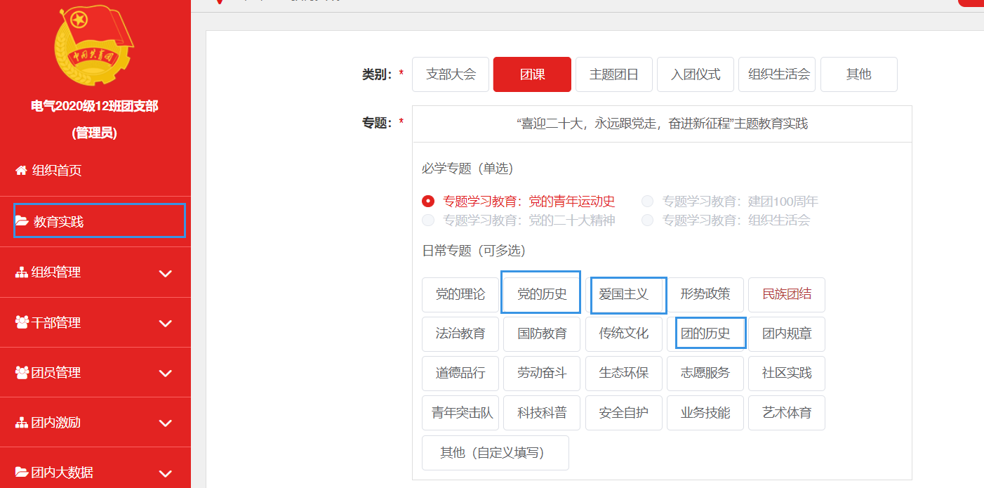主题团课结束后,所有团支部都需将团课开展情况录入 “智慧团建”系统中“教育实践——团课——专题学习教育:党的青年运动史“中。
