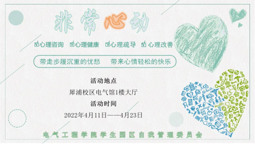 为更好落实教育部和省教育厅相关文件,促进2022年“3.25-善爱我”大学生校园心理文化节活动的全面开展,结合建团100周年的时代背景,学院组织开展“非常心动”心理互动活动,向同学们传递自尊自信,积极向上的社会心态,做新时代的奋斗者。