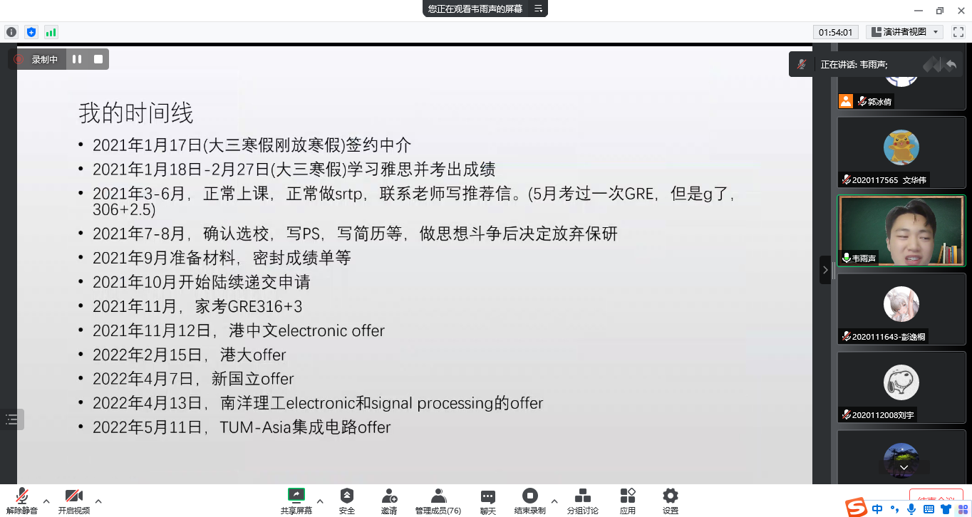 第二位分享者韦雨声同学先分享了自己目前在南洋理工大学的学习和生活情况。紧接着,他从留学概述、留学动机、留学过程以及申请专业等方面,进行了详细讲解。最后,他分享了自己先后收获香港中文大学,香港大学,新加坡国立大学,南洋理工大学等4所世界名校offer的留学申请经验,为同学们在硕士申请方面提供了宝贵的参考。