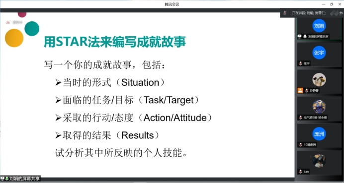 在简历的准备上,刘娟老师以“找字母”小游戏为引,让大家意识到目标的重要性。刘娟老师强调,求职意向是一份简历的“眼”,在制作简历前,要仔细阅读招聘信息、明确求职意向、明确招聘要求、找出关键信息,始终围绕着应聘单位和应聘岗位特点与需求来展示自己能力和经历。同学们要自我梳理学习期间的各项经历,充分总结个人的能力、技能和优势,同时用STAR法来编写成就故事,让HR看到你对岗位的匹配度。