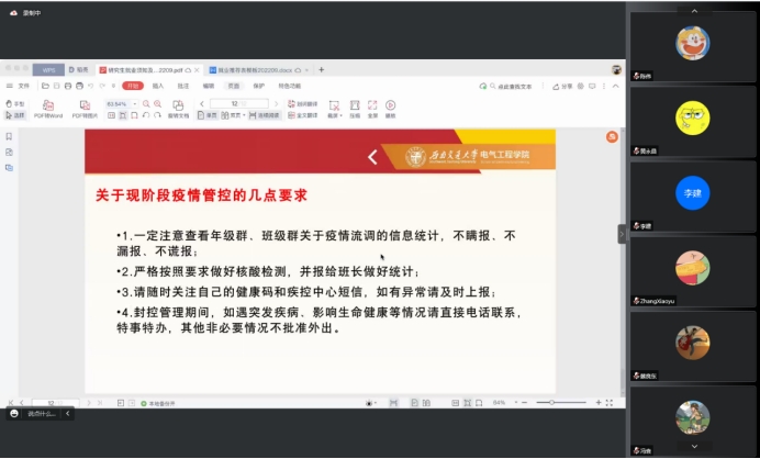 最后,针对现阶段的疫情管控,沙静馨老师再次强调了几点要求,叮嘱同学们按要求做好每日核酸检测,健康码有变化及时反馈,如果遇到突发情况或有什么情况,也请同学们不要惊慌,直接电话联系。