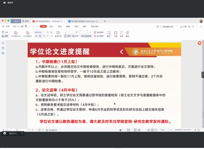 其次,沙静馨老师从中期检查和论文送审的大致时间,提醒全年级学生合理安排,找工作和写论文要两条腿走路,毕业作为前提更为重要,如果不能按时毕业,其他都为0。