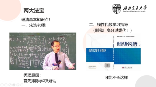 最后,庄严对《线性代数》这门课进行了经验分享,他以自身经历为例,为同学们讲述了自己学习这门课程的路历程。由于不够重视以及没有矩阵方面的基础,庄严在开始的学习阶段总是跟不上老师的节奏,所以他建议同学们,一定要跟上学习进度,利用课下的时间自学;在做题的角度上《线性代数》并不算很难,只要掌握了化简和变换的方法,大部分问题都能迎刃而解。他为同学们推荐了经典的习题册,并鼓励到:“让你变好的事情,过程都不会是轻松的。”