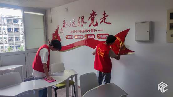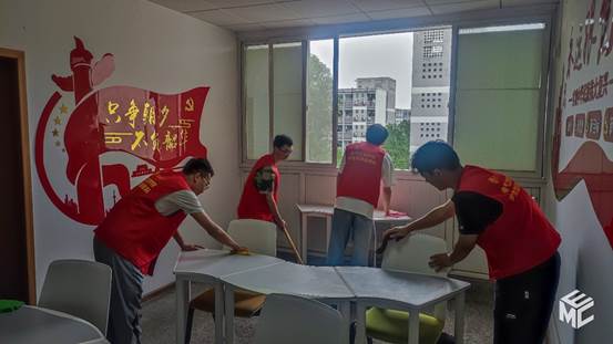 为迎接新生到来,营造一个干净整洁的寝室文化环境,8月29日下午14时30分,学院各社团成员组成的志愿者团队在学生宿舍自习室打扫卫生,重在清扫各处积灰、整理桌椅等,保证园区自习室的干净整洁。