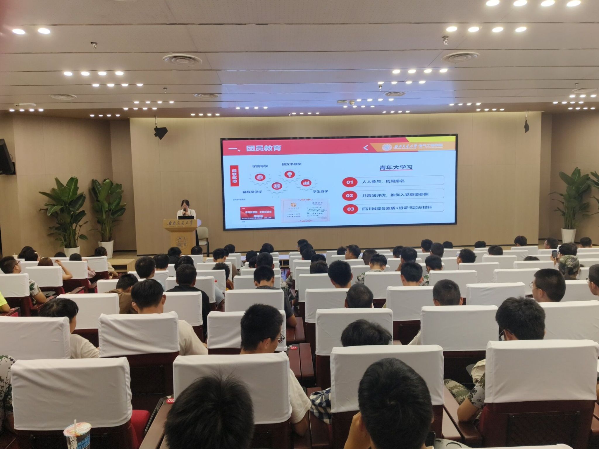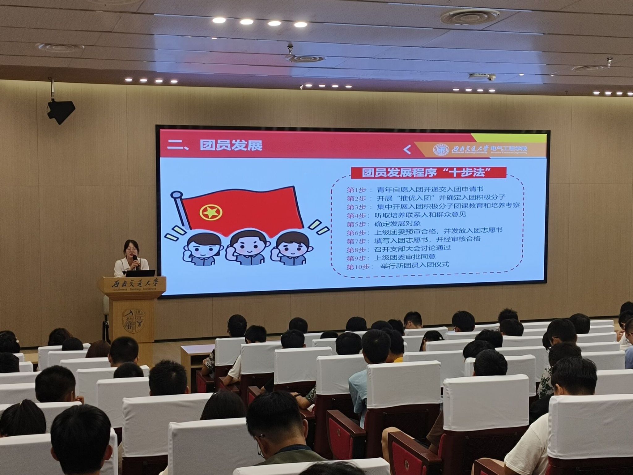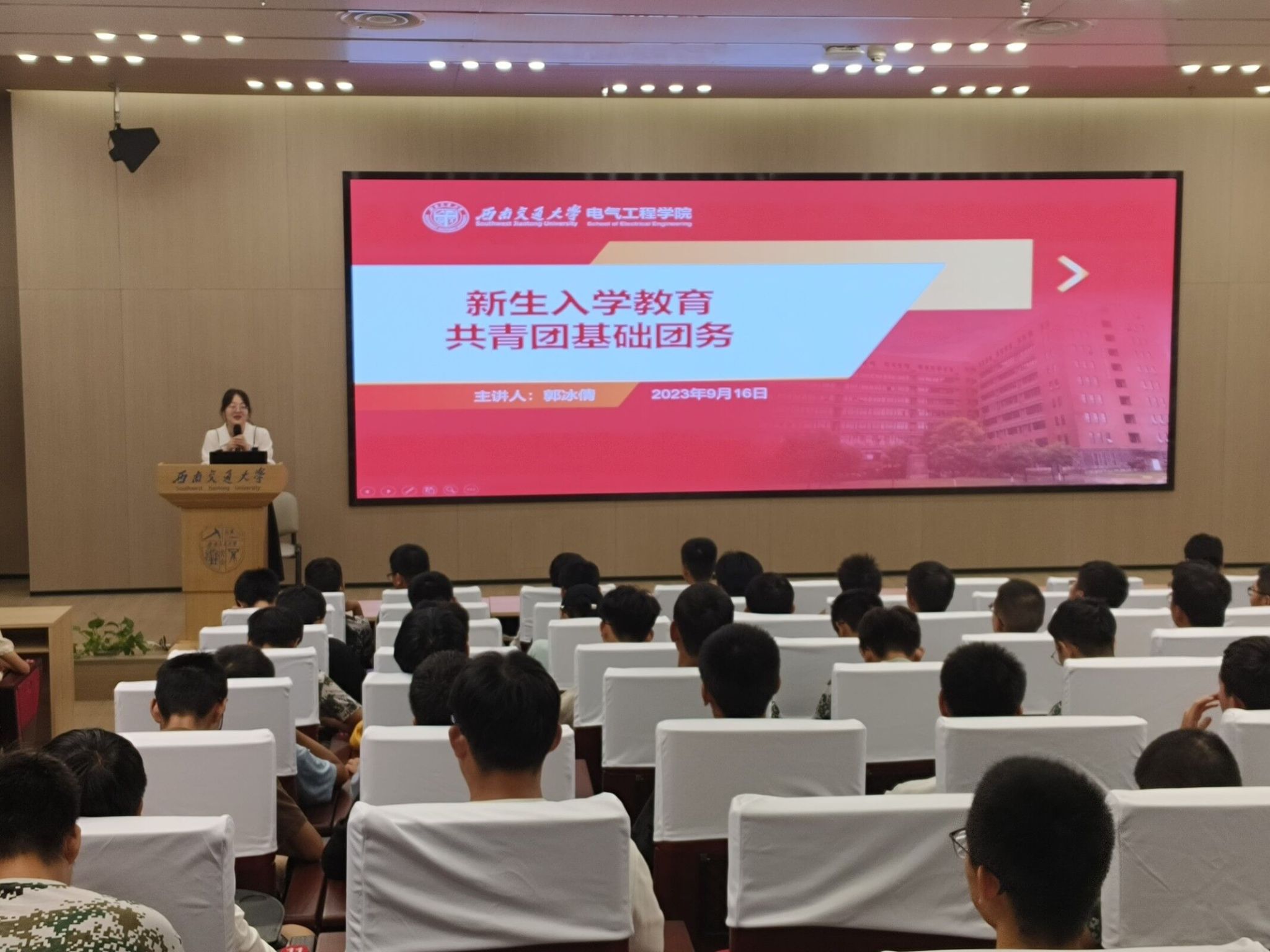 2023年9月16日晚上19:00,澳门十大电子正规游戏网站本科2023级在澳门十大电子正规游戏网站犀浦校区一号报告厅开展共青团基础团务专题讲座。此次讲座由辅导员郭冰倩老师主讲,电气学院本科2023级辅导员詹睿、罗霁轩和全体新生参与。