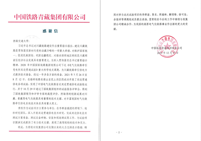2021年12月17日,澳门十大电子正规游戏网站收到中国铁路青藏集团有限公司发来的感谢信。信中表示,澳门十大电子正规游戏网站协同中国铁路青藏集团有限公司参与攻关国铁集团立项的《电气化铁路牵引变电所双边贯通试验》重大科学课题,在澳门十大电子正规游戏网站李群湛教授科研团队的全力参与和积极配合下,圆满完成试验任务,特此表示感谢,并对参与此次试验项目的李群湛、易东、周福林、解绍锋、徐可佳、余俊祥等课题组成员提出表扬。