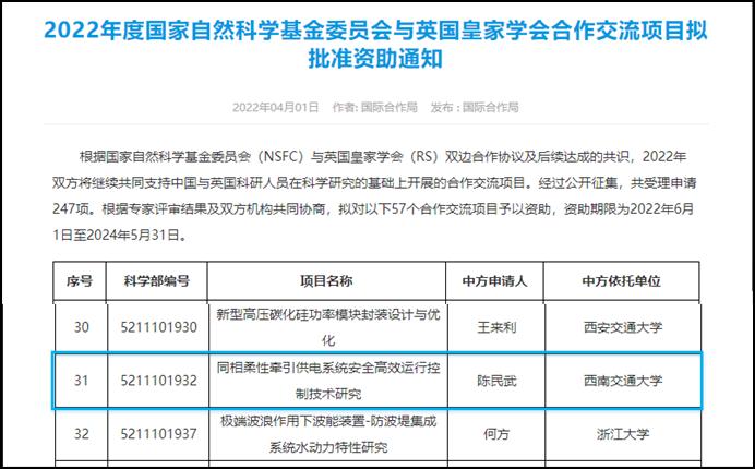近日,十大电子正规游戏官网陈民武教授与英国利物浦大学Tian Zhongbei博士作为双方负责人获批国家自然科学基金委员会与英国皇家学会(NSFC-RS)合作交流项目《同相柔性牵引供电系统安全高效运行控制技术研究》。该项目实现了国际合作交流基金项目新进展。