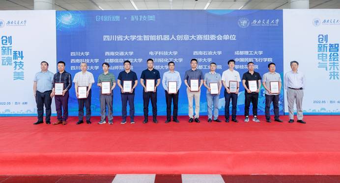 最后,高波副处长、康国政副校长共同为四川省大学生智能机器人创意大赛组委会单位颁发证书。与会代表上台见证首届四川省大学生智能机器人创意大赛正式开幕。
