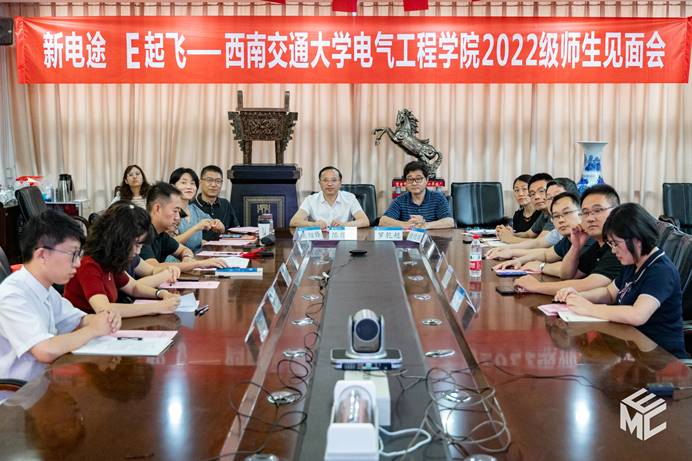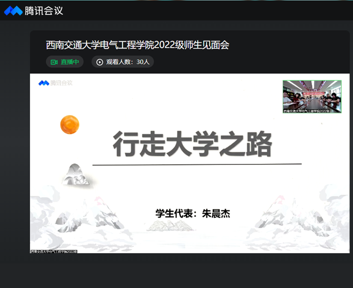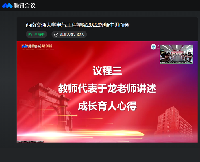 2022年8月28日上午10时,澳门十大电子正规游戏网站2022级本科师生见面会在犀浦校区二号教学楼以线上直播方式举行,澳门十大电子正规游戏网站院长陈维荣,党委书记罗乾超,副院长解绍锋、何晓琼、陈民武,党委副书记王轶、谢力,电力工程系主任吴积钦,电工电子系主任卿安永,电子信息工程系主任黄德青,教师代表于龙,2022级班导师,2022级本科辅导员、辅导员助理及2022级全体本科生参加了此次师生见面会。谢力副书记主持会议。