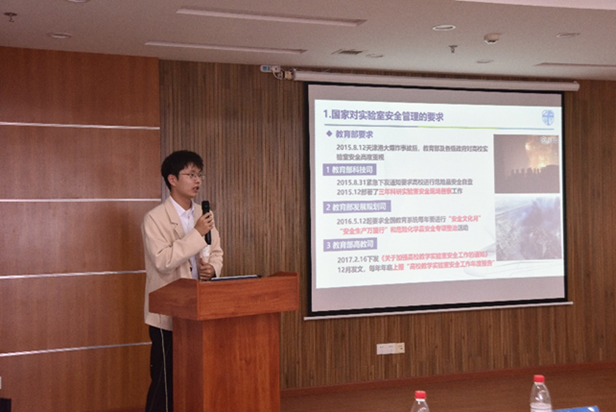 最后,由澳门十大电子正规游戏网站实验室安全大使团成员龚锦杰(信息科学与技术学院)介绍学校实验室安全管理相关知识。龚锦杰通过从“国家对实验室安全工作的要求”、“我校实验室安全管理工作”、“我校实验室安全教育宣传活动”三个方面进行讲解,重点介绍了教育部检查指标、危险化学品及特种设备的管理。讲解中龚同学通过动画的形式,让大家更加容易了解实验室安全的知识。他还介绍了学校实验室安全大使团,呼吁同学能够积极参加,让师生一起携手共建和谐平安校园。