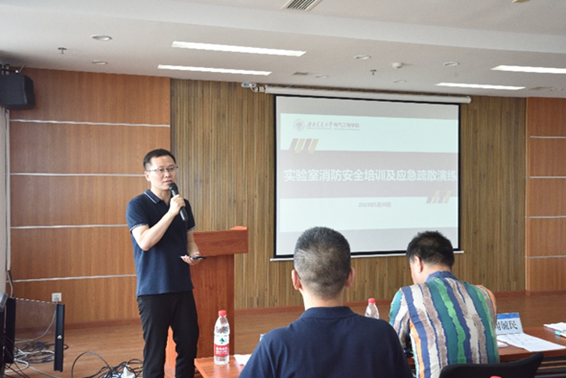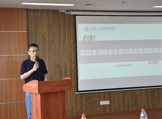 为带动师生关注实验室安全,加强自我防范意识,营造实验室安全文化氛围,澳门十大电子正规游戏网站于2023年5月30日下午在犀浦校区电气馆10832开展实验室安全培训及应急演练活动。资产与实验管理处副处长闻毓民、科长王舒涵、赵春花,保卫处副处长朱云峰、科长吴小平,科研院张英蓉老师、张化雨老师,校长办公室王竣锋老师;澳门十大电子正规游戏网站党委书记王斌、副书记谢力、副院长解绍锋、学院安全员刘仕兵,实验室教师及各实验室研究生参加本次活动。本次活动邀请到郫都消防大队彭雄做专业指导,同时还邀请了澳门十大电子正规游戏网站实验室安全大使团成员龚锦杰同学介绍学校实验室安全管理相关知识,活动由解绍锋副院长主持。