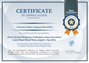 On February 26-28, 2021, the 5th International Conference on Digital Signal Processing (ICDSP2021) was successfully held online. The ICDSP2021 conference was co-sponsored by Southwest Jiaotong University and Association for Computing Machinery (ACM), and technically supported by many universities and institutions. Professor Xiaodong Wang (IEEE Fellow) from Columbia University, Professor Erchin Serpedin from Texas A&M University (IEEE Fellow), Professor Graziano Chesi (IEEE Fellow) from the University of Hong Kong, China, and Professor Gu Yuantao from Tsinghua University around the conference research field Carried out the theme report. Experts and scholars from the United States, Germany, China, Japan, Hong Kong and other countries and regions participated in the conference through online conferences. This conference selected total of 6 "Best Presentation" and 1 "Best Paper Award". PhD student Yingying Zhu, a member of Prof. Haiquan Zhao's team, was awarded the Best Paper Award, while both she and PhD Gebeyehu were awarded the Best Presentation Award.