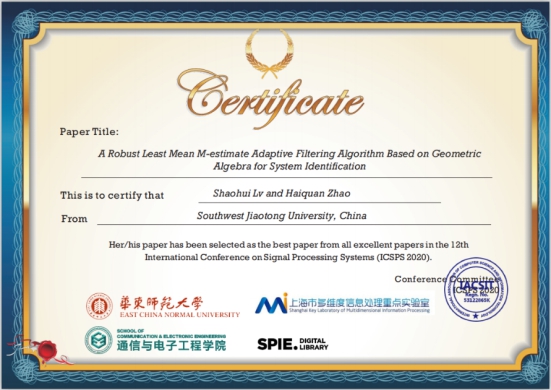 Recently, Prof. Haiquan Zhao's team from the School of Electrical Engineering won the Best Paper Award and Best Presentation Award from International Conference on Digital Signal Processing (ICDSP) and International Conference on Signal Processing Systems (ICSPS).