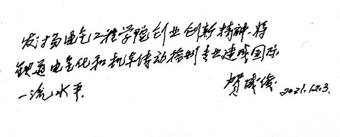 最后贺教授留下一段寄语鼓舞当代交大电气学子在奋斗中砥砺前行,他写道:“发扬澳门十大电子正规游戏网站创业创新精神,将铁道电气化和机车传动控制专业建成国际一流水平”。贺教授严于律己、言传身教,培养了一批又一批铁道电气化与自动化英才,他敢为人先、勇于创新、务实奋进、迎难而上、辛勤耕耘、著书立说的精神都值得电气学子深深领悟和学习。