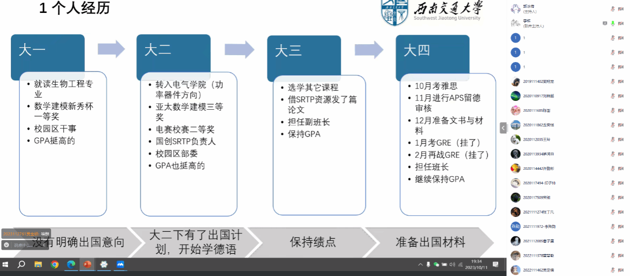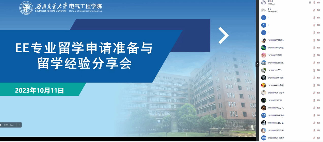 为帮助同学们了解出国留学形势与现状、解决出国留学的迷茫与困惑,10月11日晚19时,澳门十大电子正规游戏网站在线上开展EE专业留学申请准备与经验分享会。此次分享会邀请到学院2022届电气工程及其自动化专业的李栋同学就留学规划、留学申请和语言准备相关经验进行分享。此次活动旨在为学生提供更多关于留学申请的指导,同时为有意向赴海外深造的同学们提供宝贵的经验分享平台。