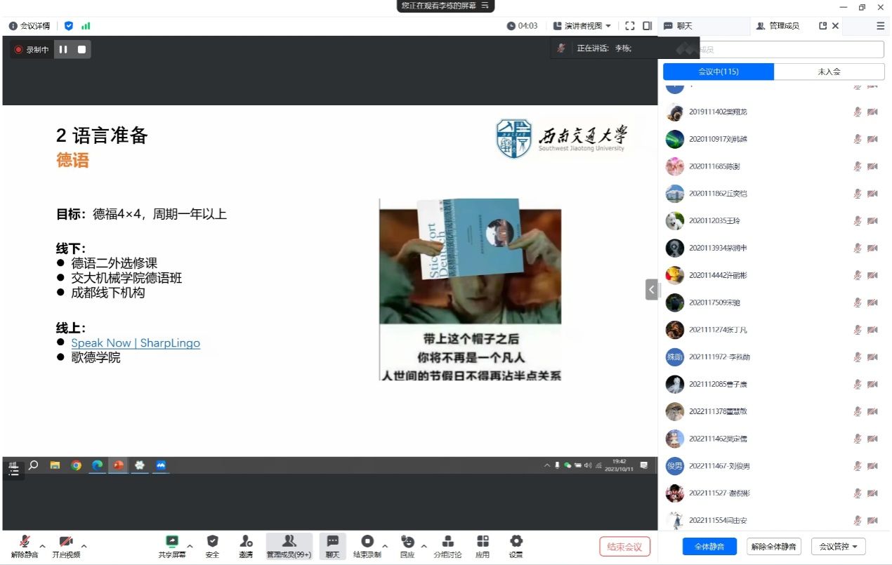 此后,李栋重点以德国留学为例,重点介绍从语言准备、资源收集方面的相关经验,为同学们推荐了雅思的口语阅读的部分的学习网站,以及德语学习的校内外线上线下课程。同时,在资源搜集方面,他还为同学们介绍了学校平台、微信公众号、小红书等平台和社交媒体的资源分享,为同学们的留学提供坚实的基础保障。