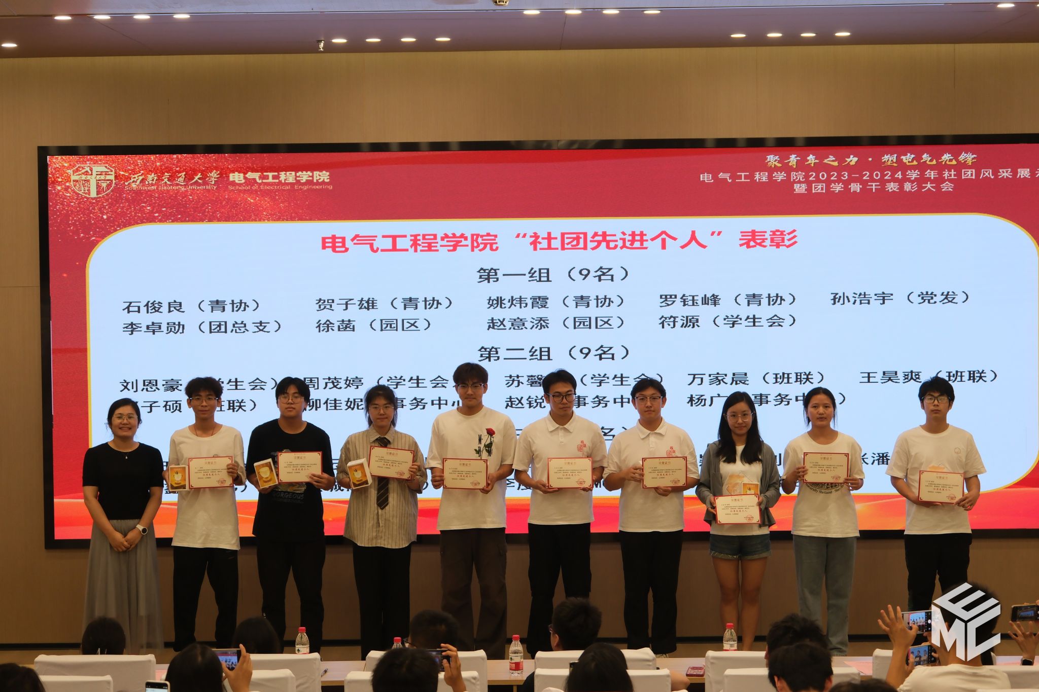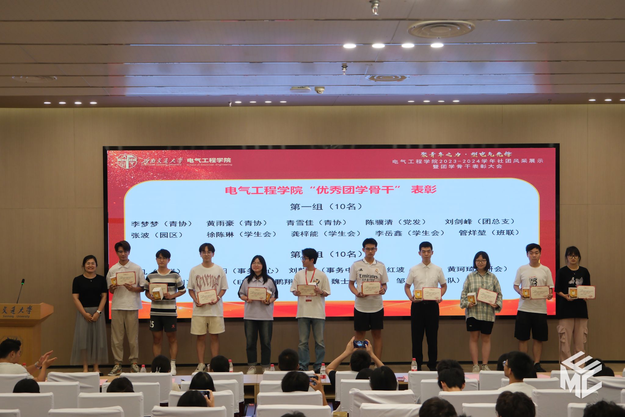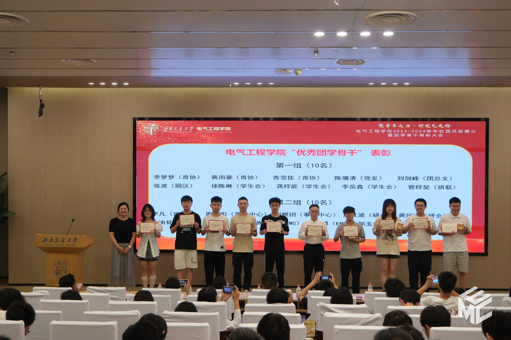 2024年6月14日19时,澳门十大电子正规游戏网站2023-2024学年“聚青年之力·塑电气先锋”社团风采展示暨团学骨干表彰大会于犀浦校区图书馆二号报告厅举办。学院团委书记张异老师,学院学生社团(组织)学生会、青年志愿者协会、媒体事务中心(EMC)、班级联合会(学业发展指导中心)、大学生科技活动中心、学生事务中心、研究生会、园区自我管理委员会、党员发展服务中心、辩论队、团总支共11个社团(组织)的指导老师及骨干成员们参加会议。