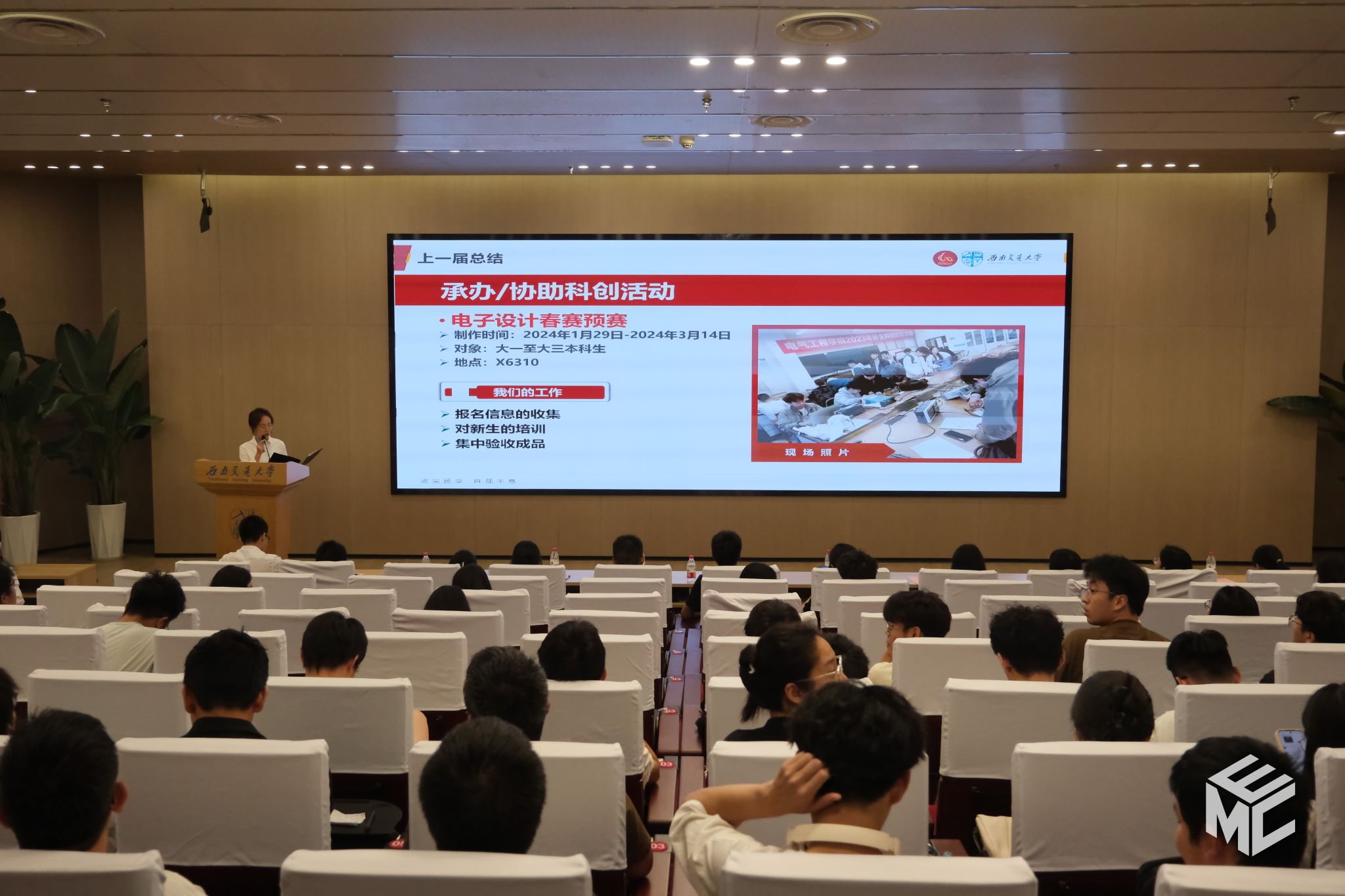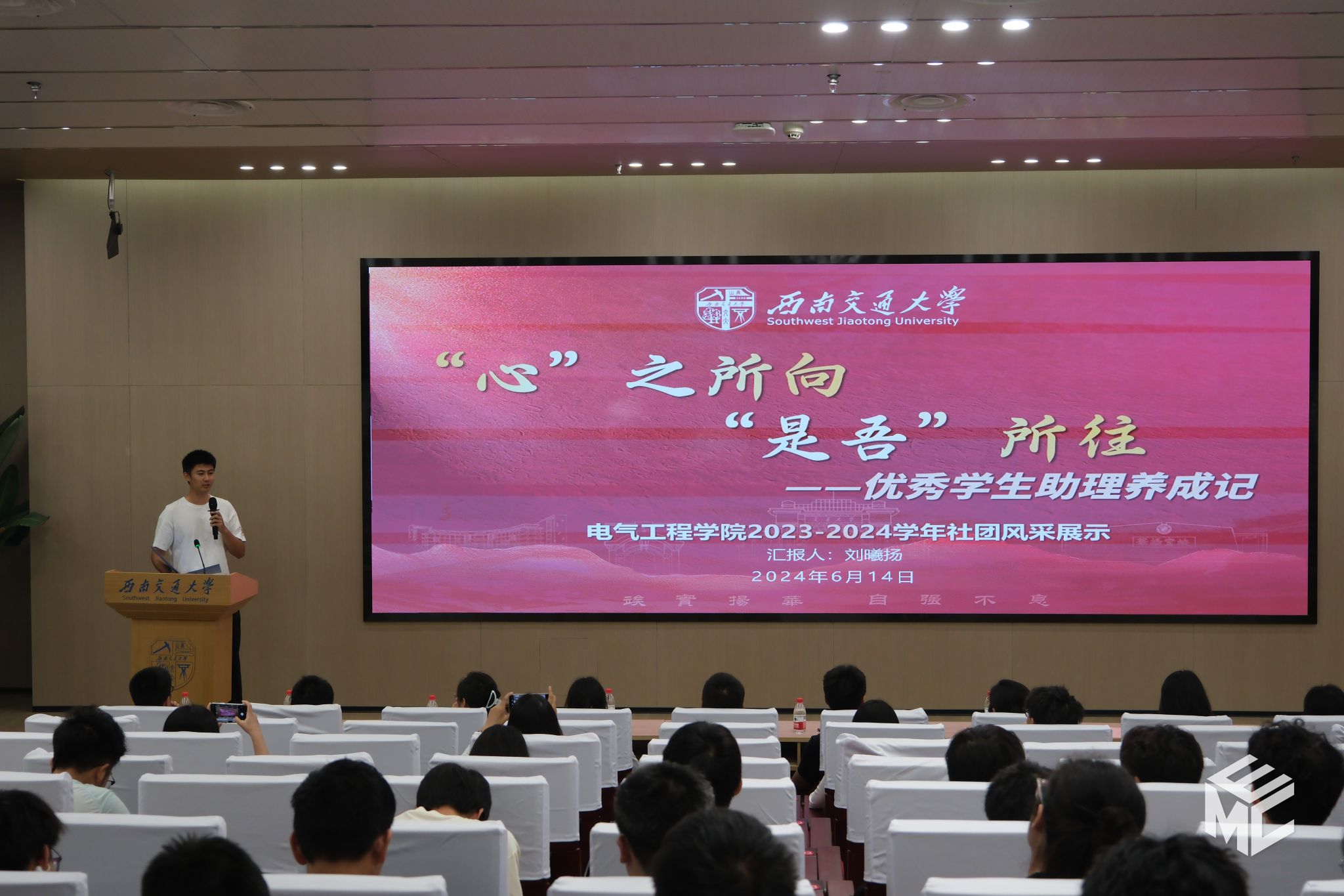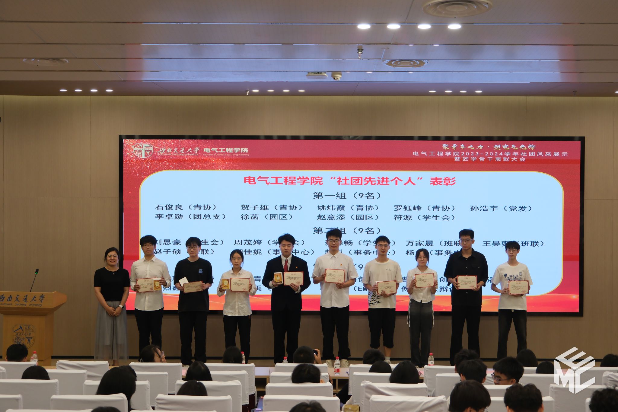 2024年6月14日19时,澳门十大电子正规游戏网站2023-2024学年“聚青年之力·塑电气先锋”社团风采展示暨团学骨干表彰大会于犀浦校区图书馆二号报告厅举办。学院团委书记张异老师,学院学生社团(组织)学生会、青年志愿者协会、媒体事务中心(EMC)、班级联合会(学业发展指导中心)、大学生科技活动中心、学生事务中心、研究生会、园区自我管理委员会、党员发展服务中心、辩论队、团总支共11个社团(组织)的指导老师及骨干成员们参加会议。