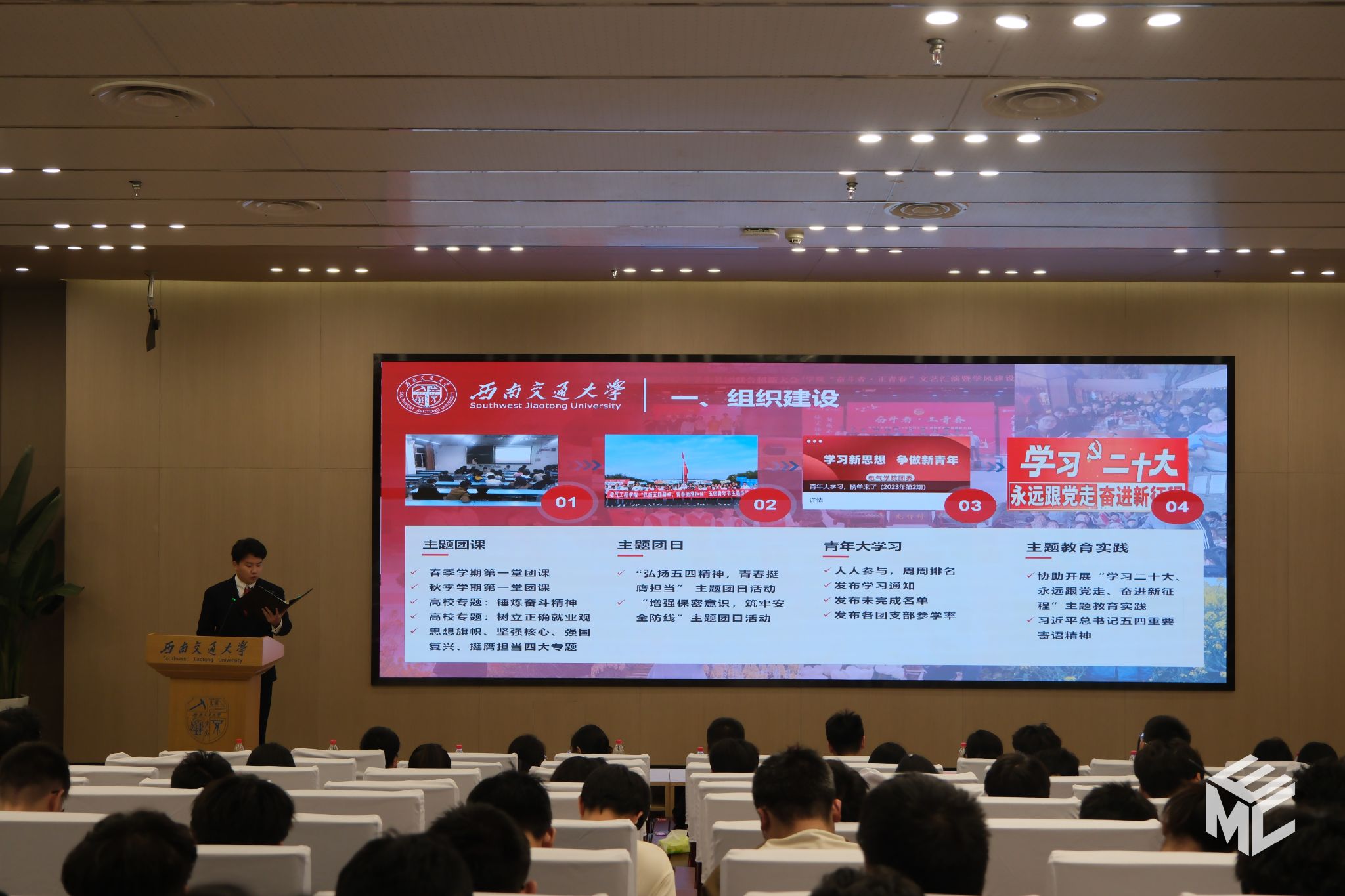 大会首先开展“师生共上一堂团课”。本次团课通过视频《青年是什么》,展现了各行各业的青年榜样以实干报效祖国的先进事迹,引导同学们将奋斗的汗水洒在祖国大地上。