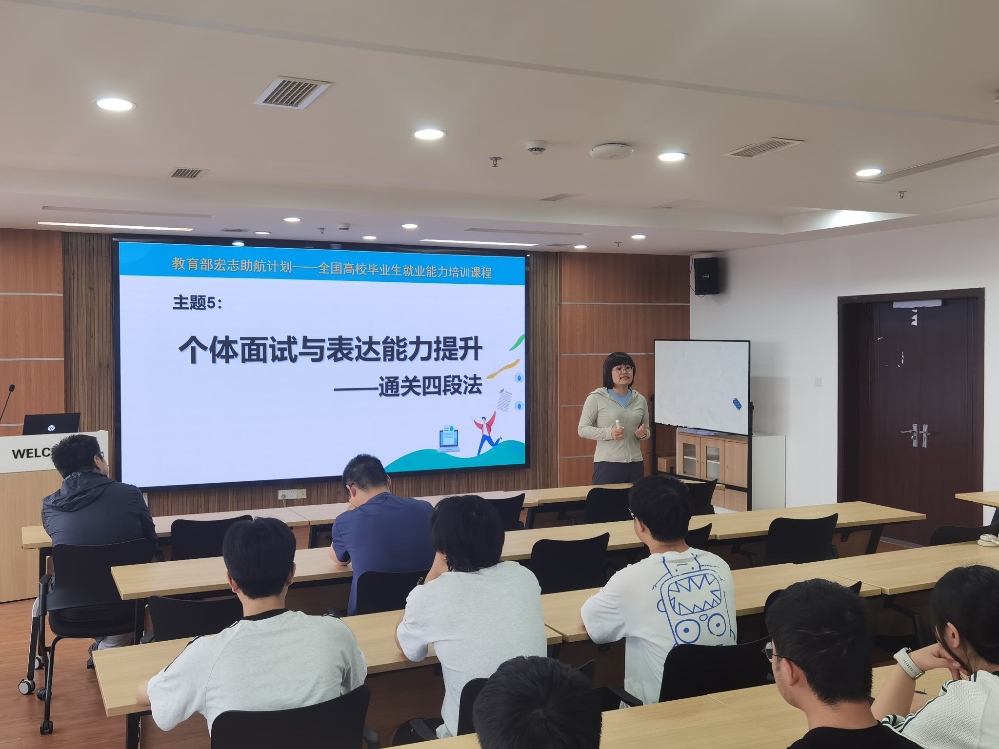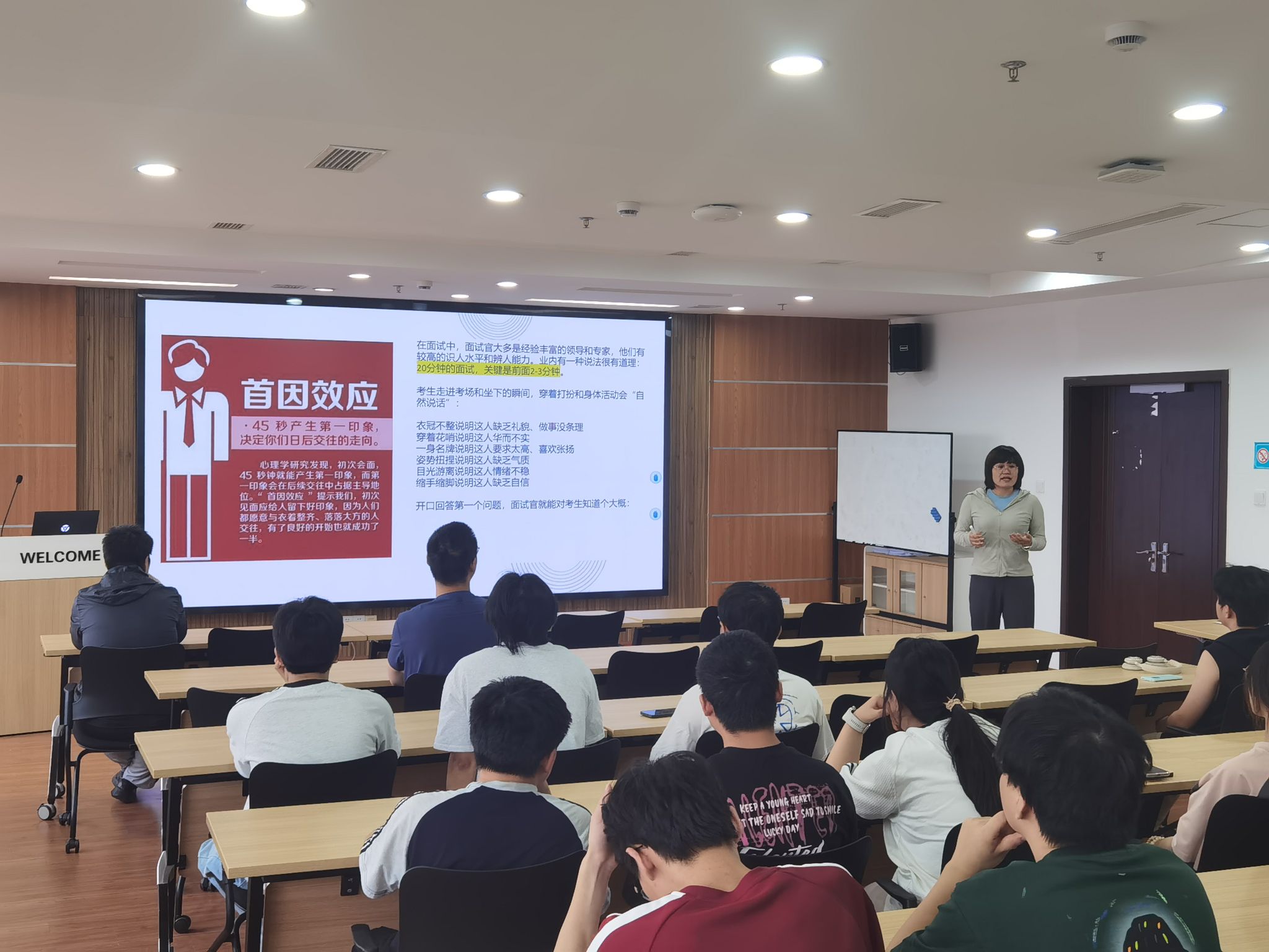 活动现场,主讲人张异老师从表达逻辑到实战技巧层层递进:结合真实求职案例,拆解 “一分钟自我介绍”的构建密码,指导学生提炼“个人标签 + 岗位适配亮点”,摒弃“流水账”式表达;从坐姿神态的细节规范,到语言节奏的把控技巧,系统讲解面试礼仪与表达逻辑,破解“紧张卡壳”困境。