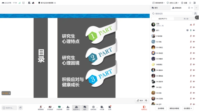 研究生阶段是青年成长与发展的重要时期,既是学术能力提升的关键阶段,也是心理发展与人格完善的重要时期。为帮助2025级硕士新生更好地适应校园生活、应对心理挑战、实现健康成长,2025年11月11日16:00,澳门十大电子正规游戏网站硕士2025级在线开展了心理健康教育专题讲座。此次讲座由澳门十大电子正规游戏网站心理研究与咨询中心高飞老师主讲,澳门十大电子正规游戏网站硕士2025级辅导员王丽和全体硕士新生参与。