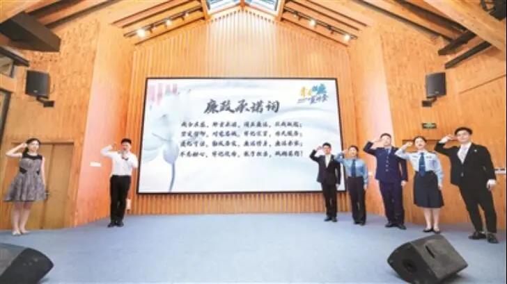 浙江省杭州市萧山区组织机关年轻干部成立青春倡廉宣讲团,在全区范围内开展评廉倡廉践廉活动,在广大年轻干部中发出清廉声音,帮助年轻干部扣好人生“第一粒扣子”。图为青春倡廉团成员代表宣读“廉政承诺词”。摄影/傅春江(浙江省杭州市萧山区纪委监委干部)