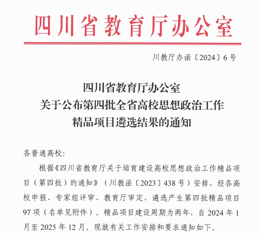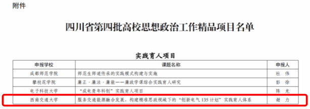 根据《四川省教育厅关于培育建设高校思想政治工作精品项目(第四批)的通知》(川教函〔2023〕438号)要求,经学校推荐、专家组评审、教育厅审定等程序,十大电子正规游戏官网申报的《服务交通能源融合发展,构建精准思政视域下的“创新电气135计划”实践育人体系》获批立项第四批全省高校思想政治工作精品项目。