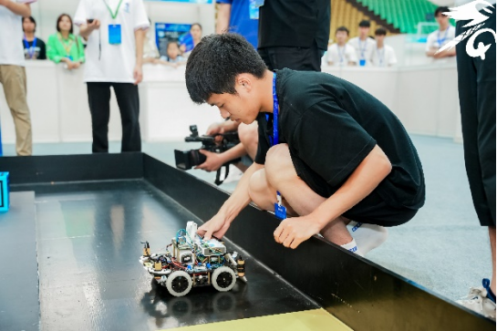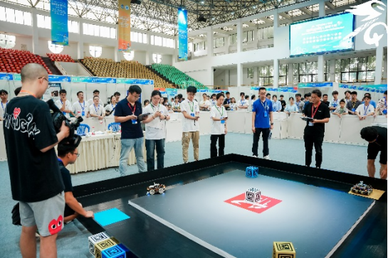 视觉对抗比赛中,机器人通过图像处理识别赛道“路障”,到达终点最终完成“打靶”。轮式格斗比赛中,各队伍的机器人造型各异,在擂台上使用不同的控制方法寻找对手并将其打下擂台,同时还要区分擂台上的能量块。现场赛况激烈,各个队伍热情对抗,激烈角逐。