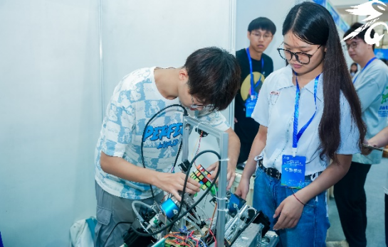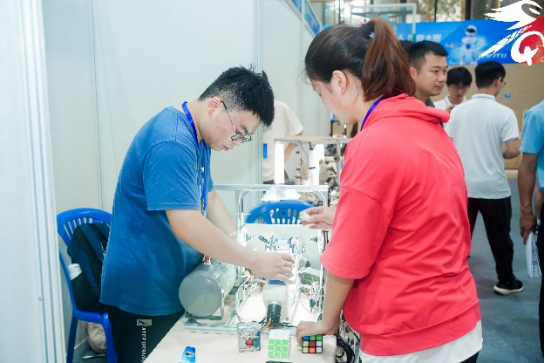 主题二魔方机器人旨在“挑战更快”,参赛队伍参照人类魔方竞速规则,设计制作魔方机器人,综合运用机械、电子、信息和自然科学知识,实现比人“计算”更快,“翻动”更加灵活迅速的目标。参赛队伍现场调试代码,指挥机器人演示魔方还原过程,挑战更快的速度。