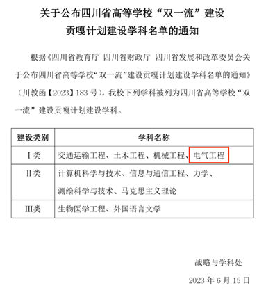 615日,四川省教育厅、四川省财政厅、四川省发展和改革委员会公布了《四川省高等学校双一流建设贡嘎计划建设学科名单》,学院电气工程学科入选了四川省高等学校双一流建设贡嘎计划I类建设学科。