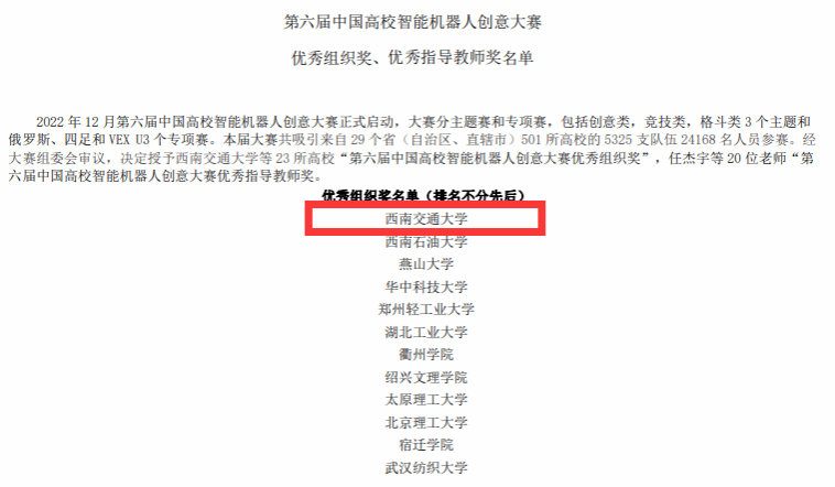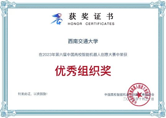 中国高校智能机器人创意大赛创办于2017年,首届大赛由中国高等教育学会、教育部工程图学课程教学指导委员会、中国高校智能机器人创意大赛组委会共同主办,浙江大学机器人研究院、中国高等教育学会工程教育专业委员会承办。大赛于2020年列入中国高等教育学会发布的全国普通高校大学生竞赛排行榜。四川省大学生智能机器人创意大赛由四川省教育厅主办,澳门十大电子正规游戏网站承办,澳门十大电子正规游戏网站协办,至今已连续举办两届,大赛自启动以来,受到省内各大高校师生的广泛关注和热烈响应。2023年,四川赛区以优异的办赛质量和高质量的国赛推选作品,荣获第六届中国高校智能机器人创意大赛优秀组织奖,学院王青元、潘育山老师荣获国赛优秀指导教师奖。