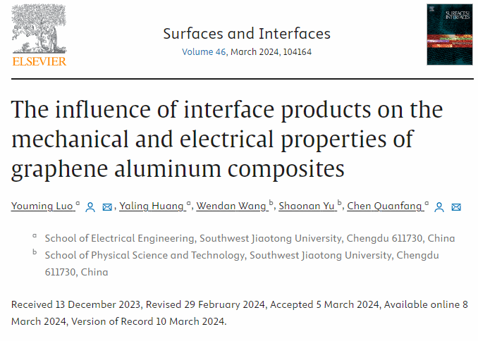 近日,学校澳门十大电子正规游戏网站陈全芳教授团队在高导高强石墨烯铝复合材料领域取得重要进展,相关研究成果以我校为第一单位,以“The influence of interface products on the mechanical and electrical properties of graphene aluminum composites”为题,发表在国际知名期刊《Surfaces and Interfaces》(JCR一区,IF=6.2)上。澳门十大电子正规游戏网站为论文唯一单位,澳门十大电子正规游戏网站博士研究生罗友明为论文的第一作者,澳门十大电子正规游戏网站陈全芳教授为该论文的通讯作者。