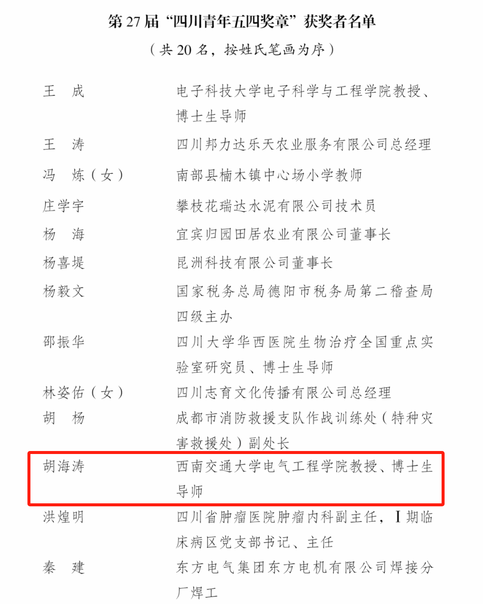 在五四青年节到来之际,为表彰先进、树立典型,共青团四川省委、四川省人力资源和社会保障厅决定进行第27届“四川青年五四奖章”、四川省“两红两优”表彰。其中,学院团委荣获“四川省五四红旗团委”称号,胡海涛教授荣获第27届“四川青年五四奖章”。