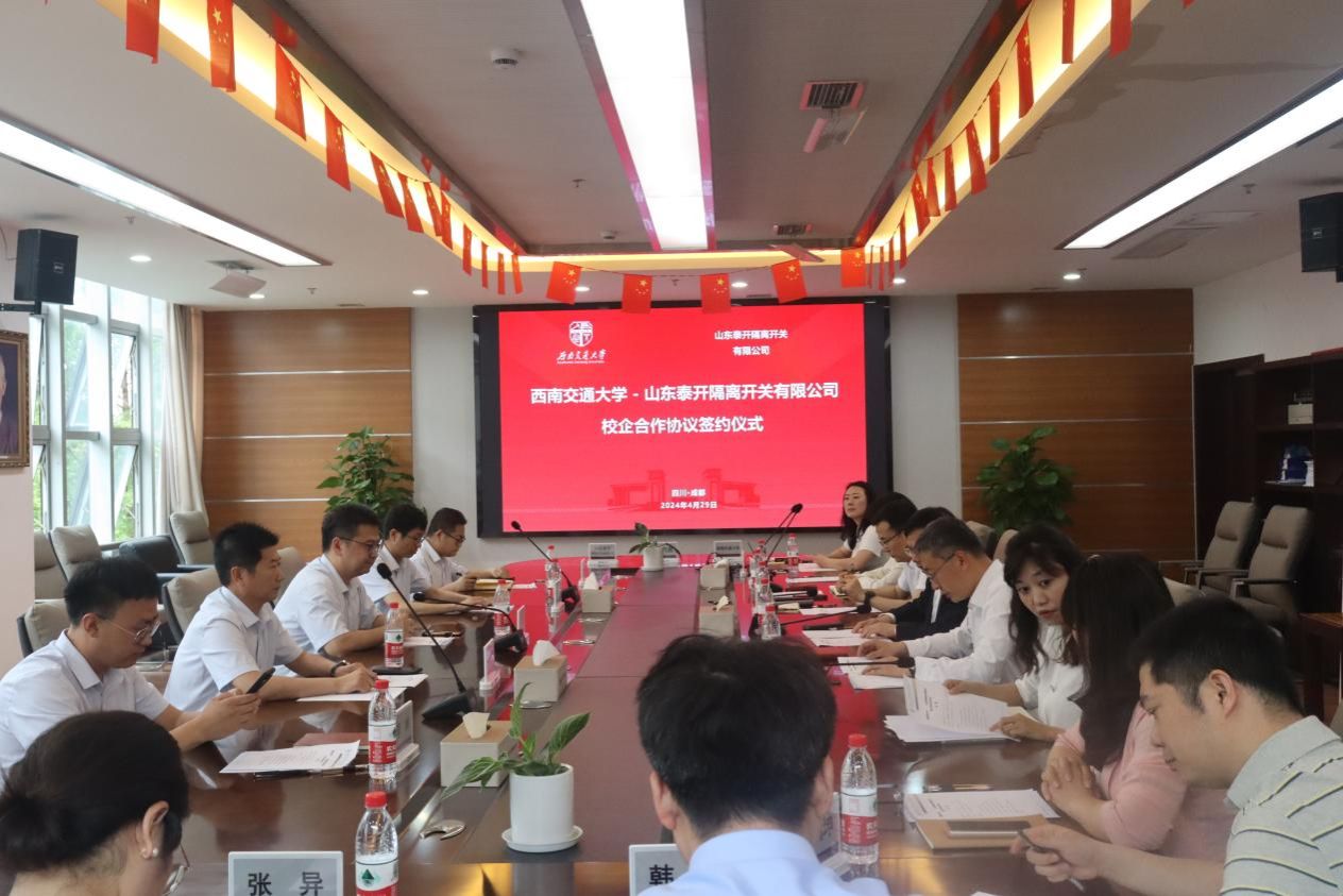 4月29日上午11时,澳门十大电子正规游戏网站与山东泰开隔离开关有限公司在犀浦校区电气馆10212会议室签署校企合作协议。山东泰开隔离开关有限公司董事长王睿、总经理李健、常务副总经理张体桂、企业发展部经理鞠恒才、总经理助理兼企管部主任李峰,澳门十大电子正规游戏网站党委常委、副校长何正友,澳门十大电子正规游戏网站党委书记王斌,合作发展处副处长温朋,澳门十大电子正规游戏网站党委副书记谢力、王轶,澳门十大电子正规游戏网站副院长何晓琼、陈民武,院长助理韩莹,教师代表麦瑞坤教授,团委书记张异等出席签约仪式。签约仪式由澳门十大电子正规游戏网站党委书记王斌主持。