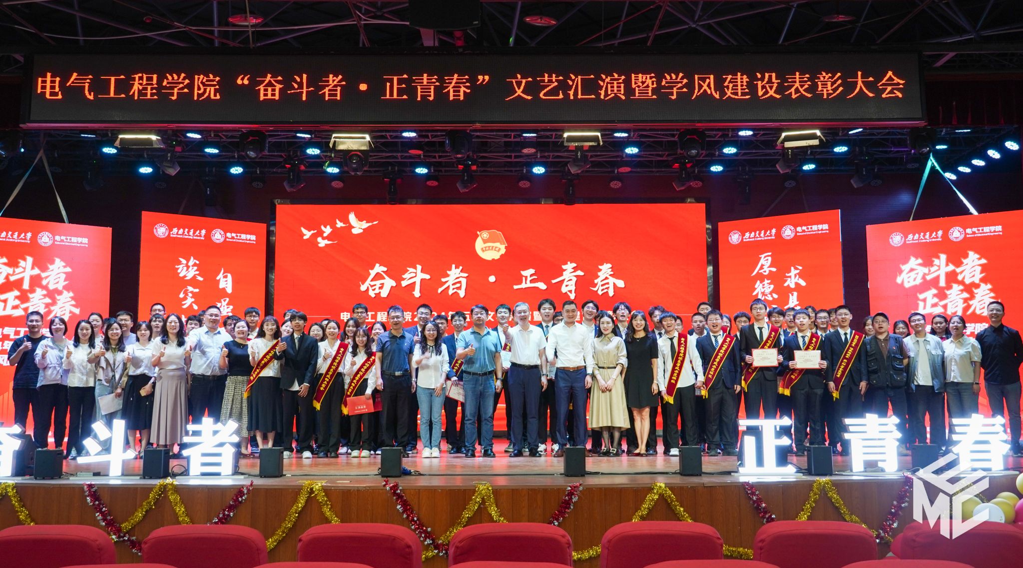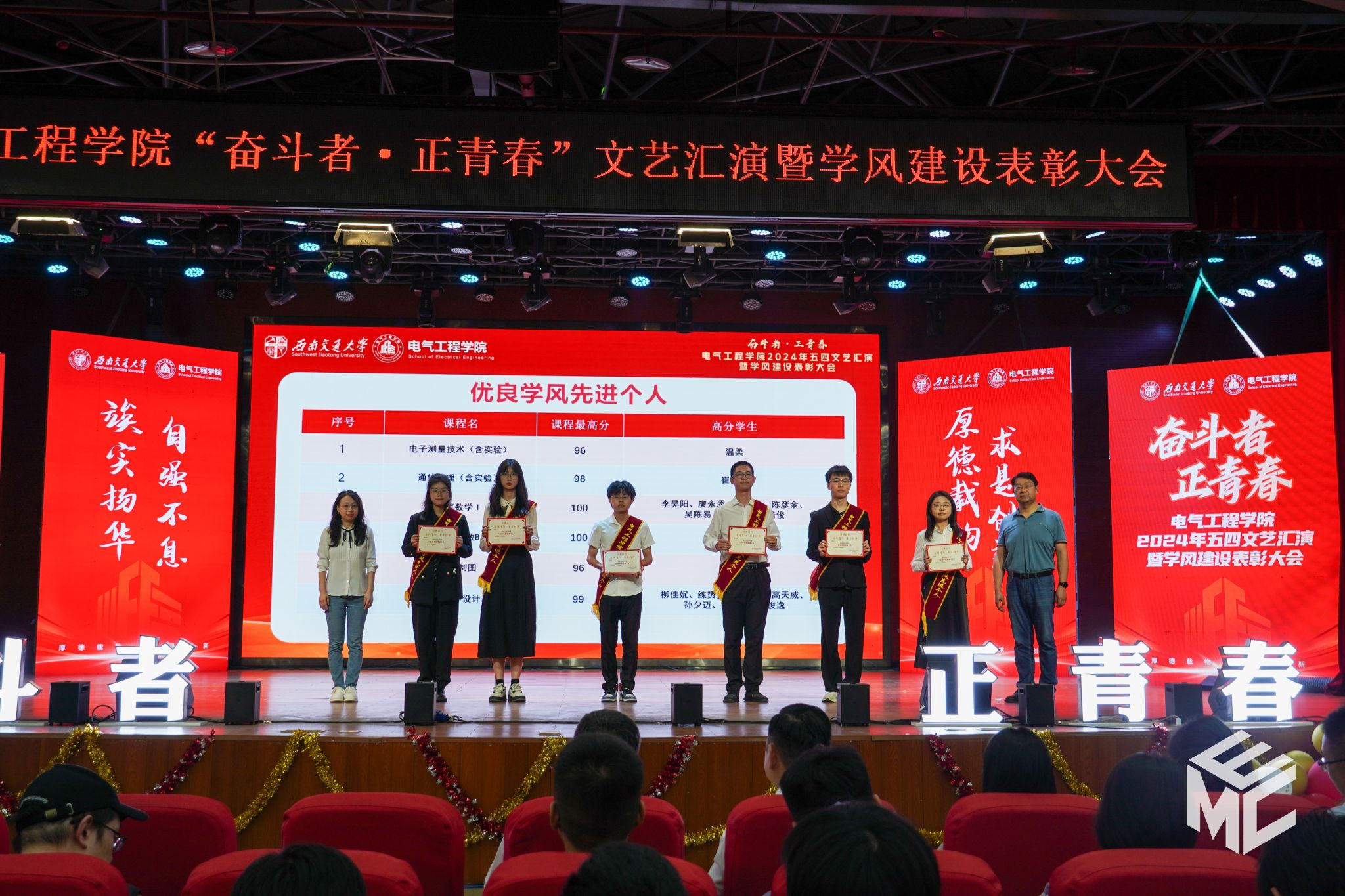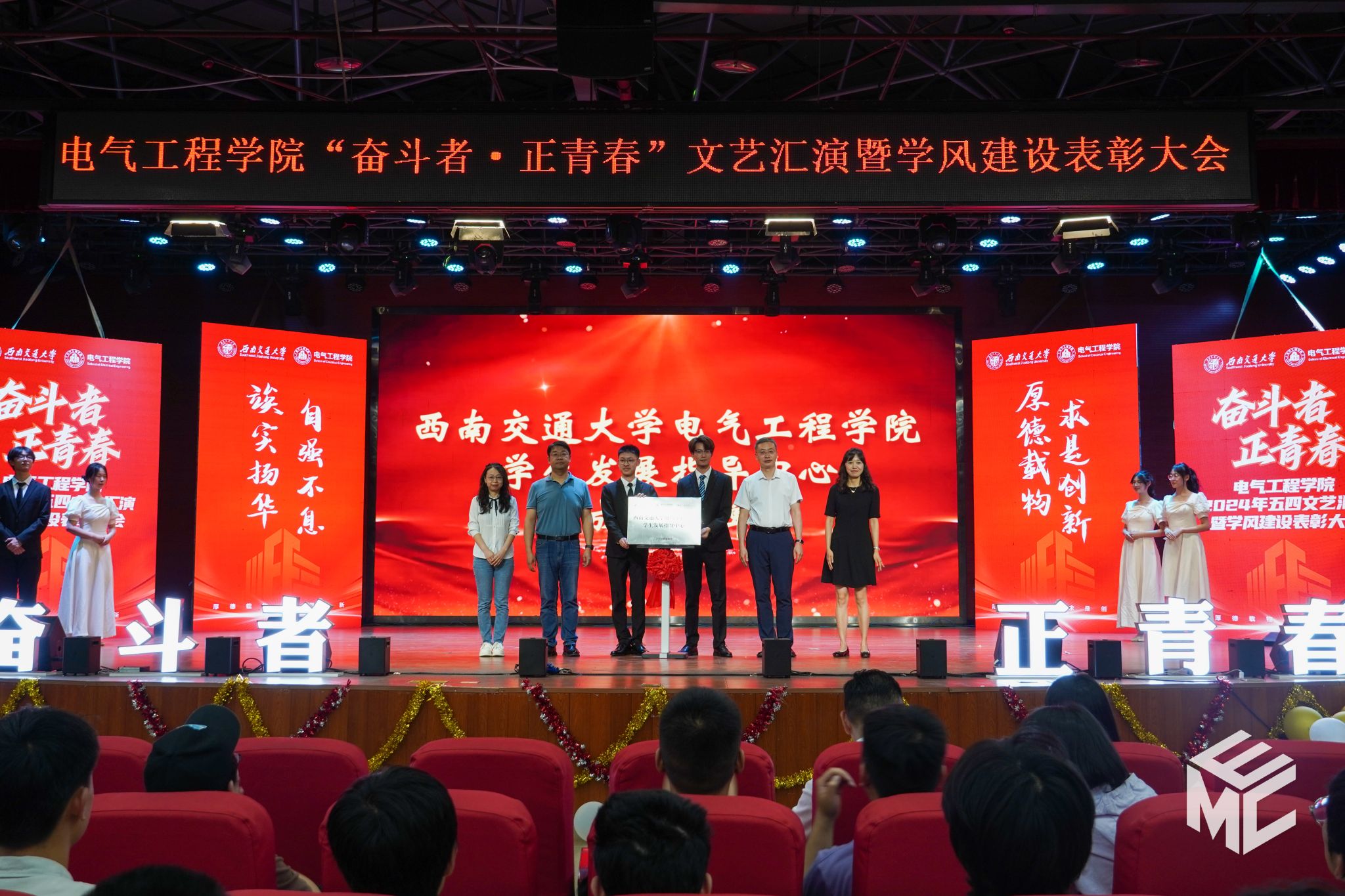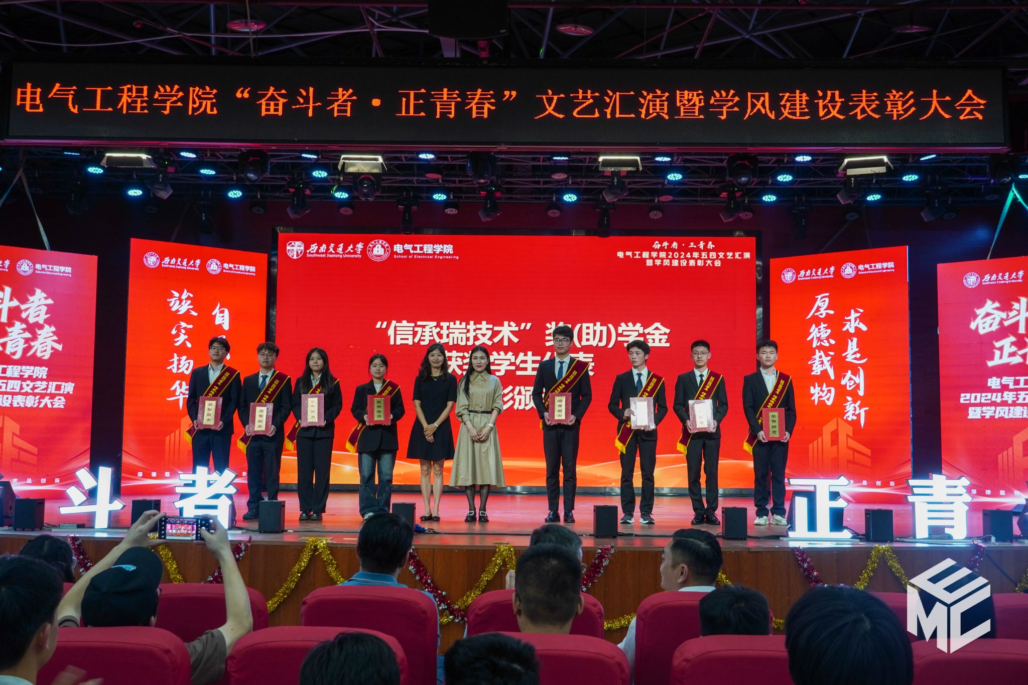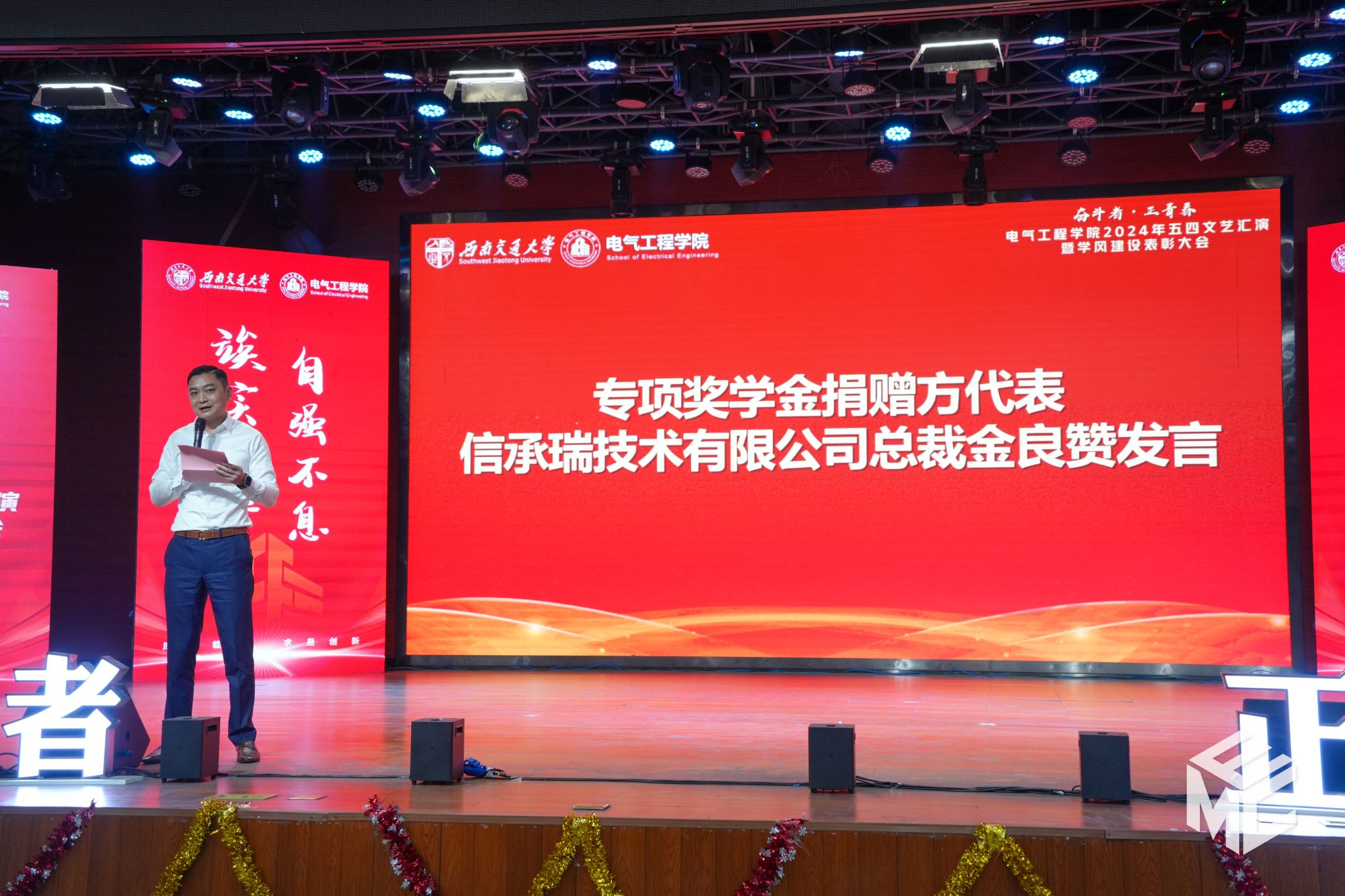 2024年4月27日晚,澳门十大电子正规游戏网站“奋斗者•正青春”2024年五四文艺汇演暨学风建设表彰大会在犀浦校区大学生活动中心如期举行。澳门十大电子正规游戏网站团委书记武俊,党委学生工作部副部长邢晓鹏,教务处副处长刘鎏,招生就业处对外联络科科长董鹏飞,澳门十大电子正规游戏网站党委书记王斌,副院长解绍锋,学院党委副书记谢力、王轶,信承瑞技术有限公司总裁金良赞,信承瑞周钗妹千万光彩基金会理事长林婷婷等出席晚会。2023级班导师及全体辅导员与同学们齐聚一堂,共同参加本次文艺汇演暨表彰大会。