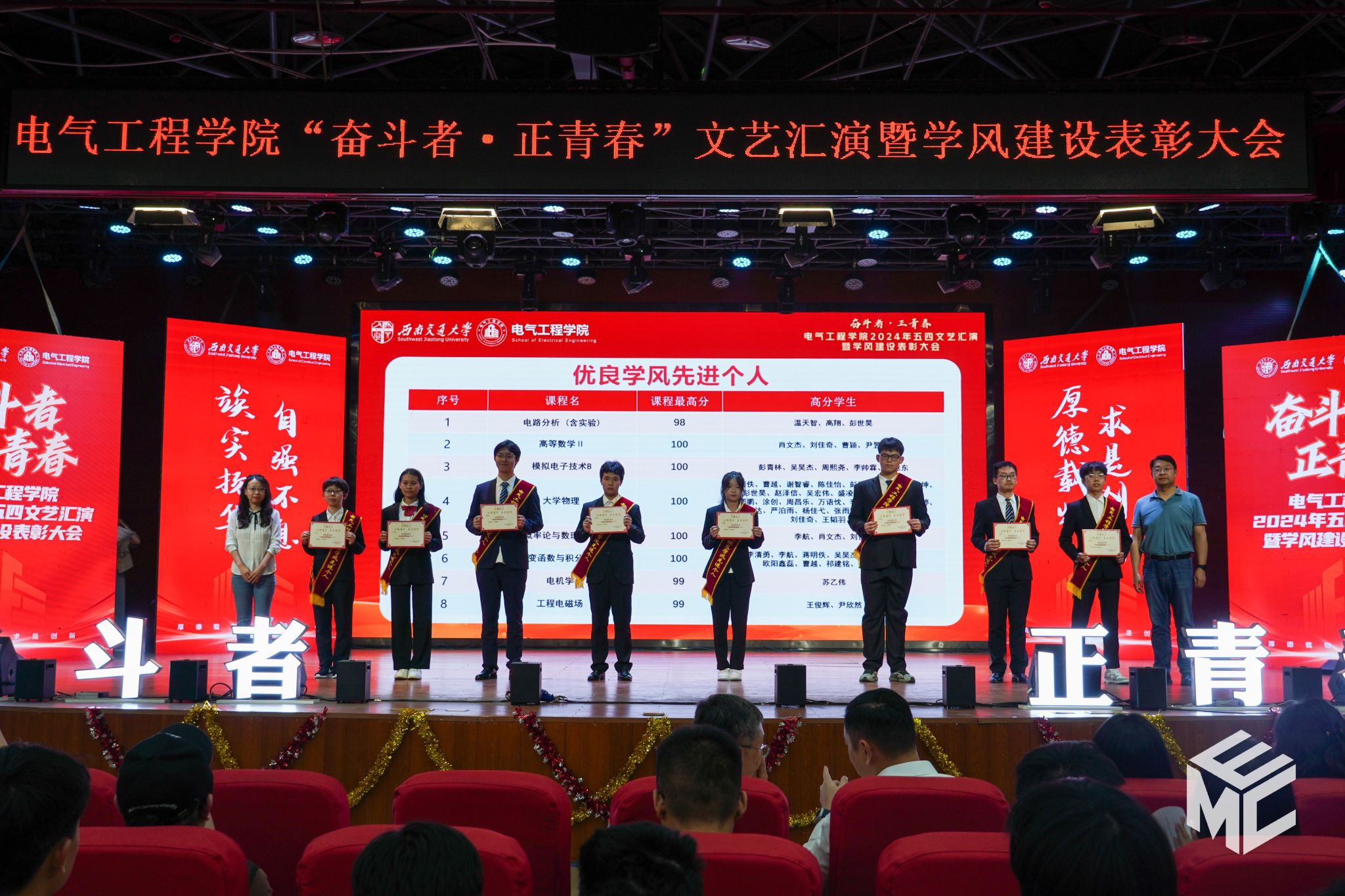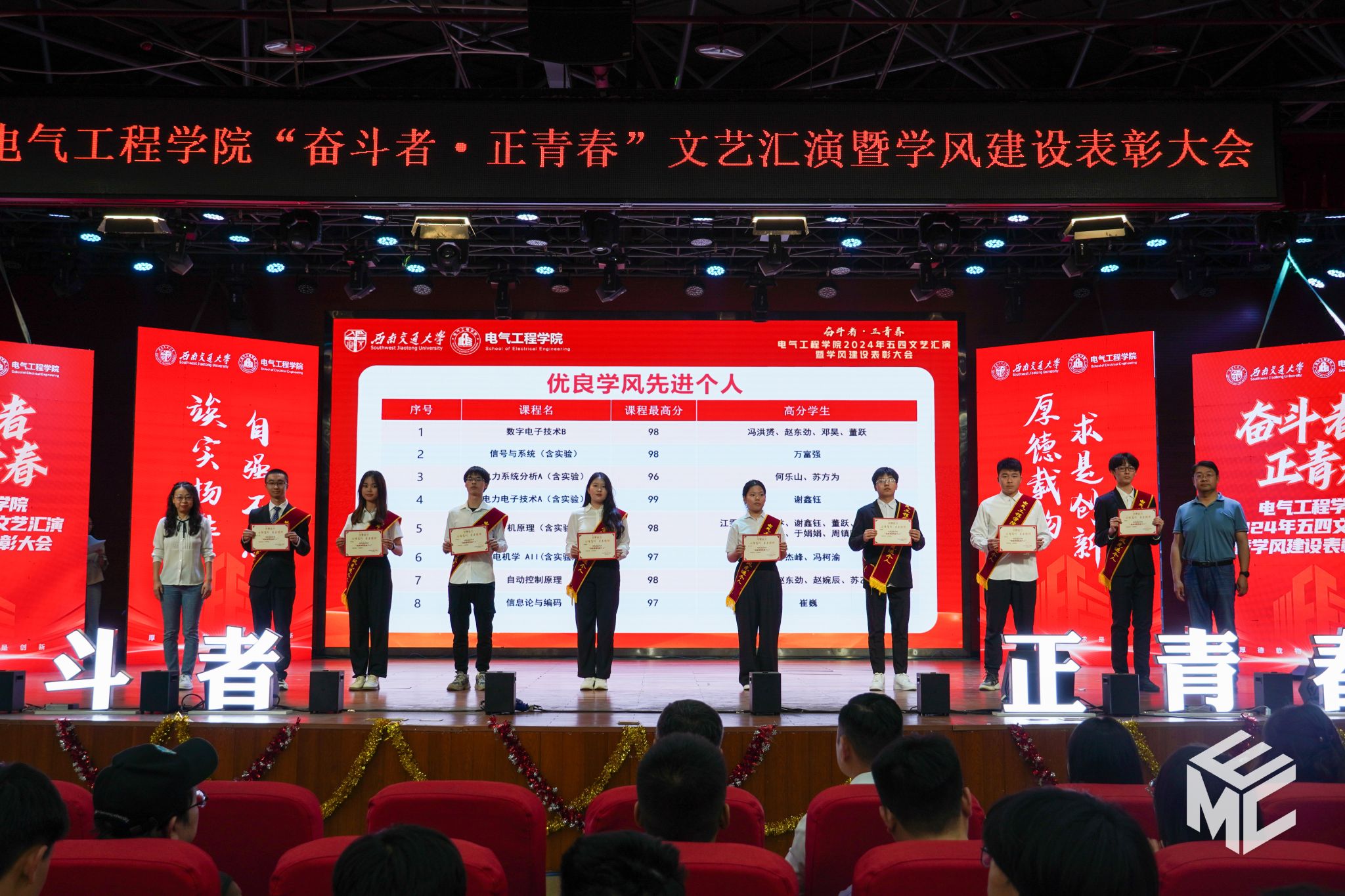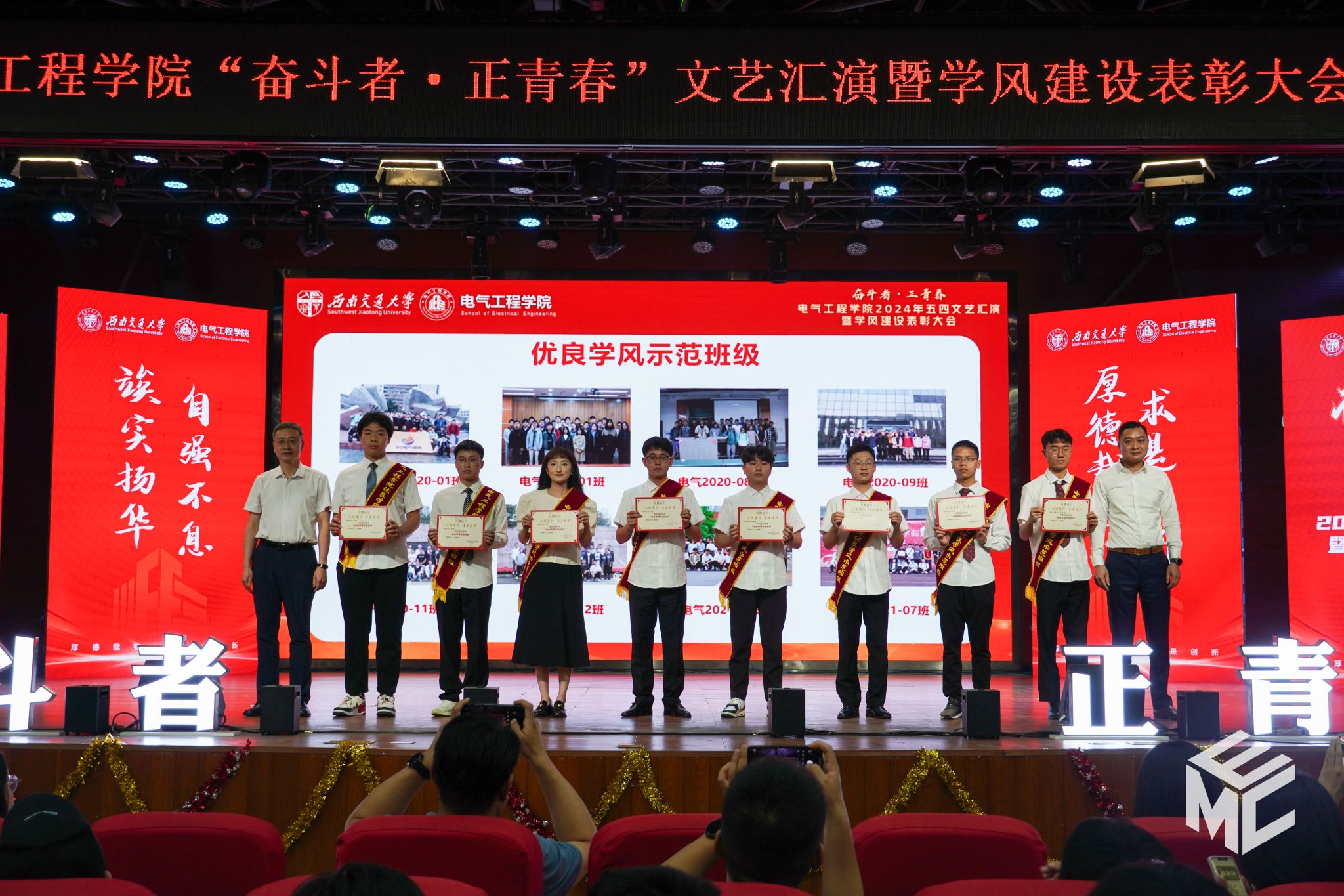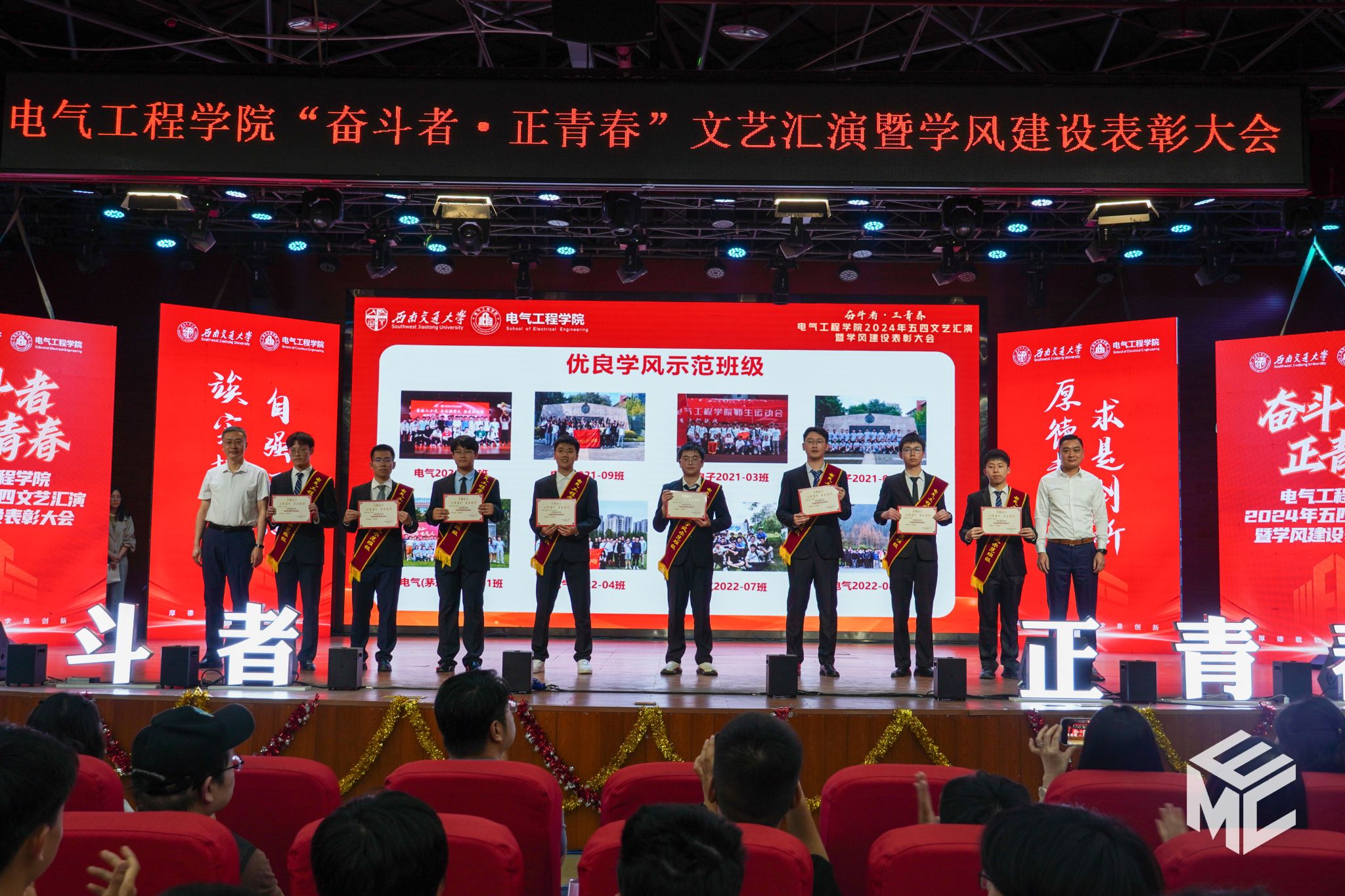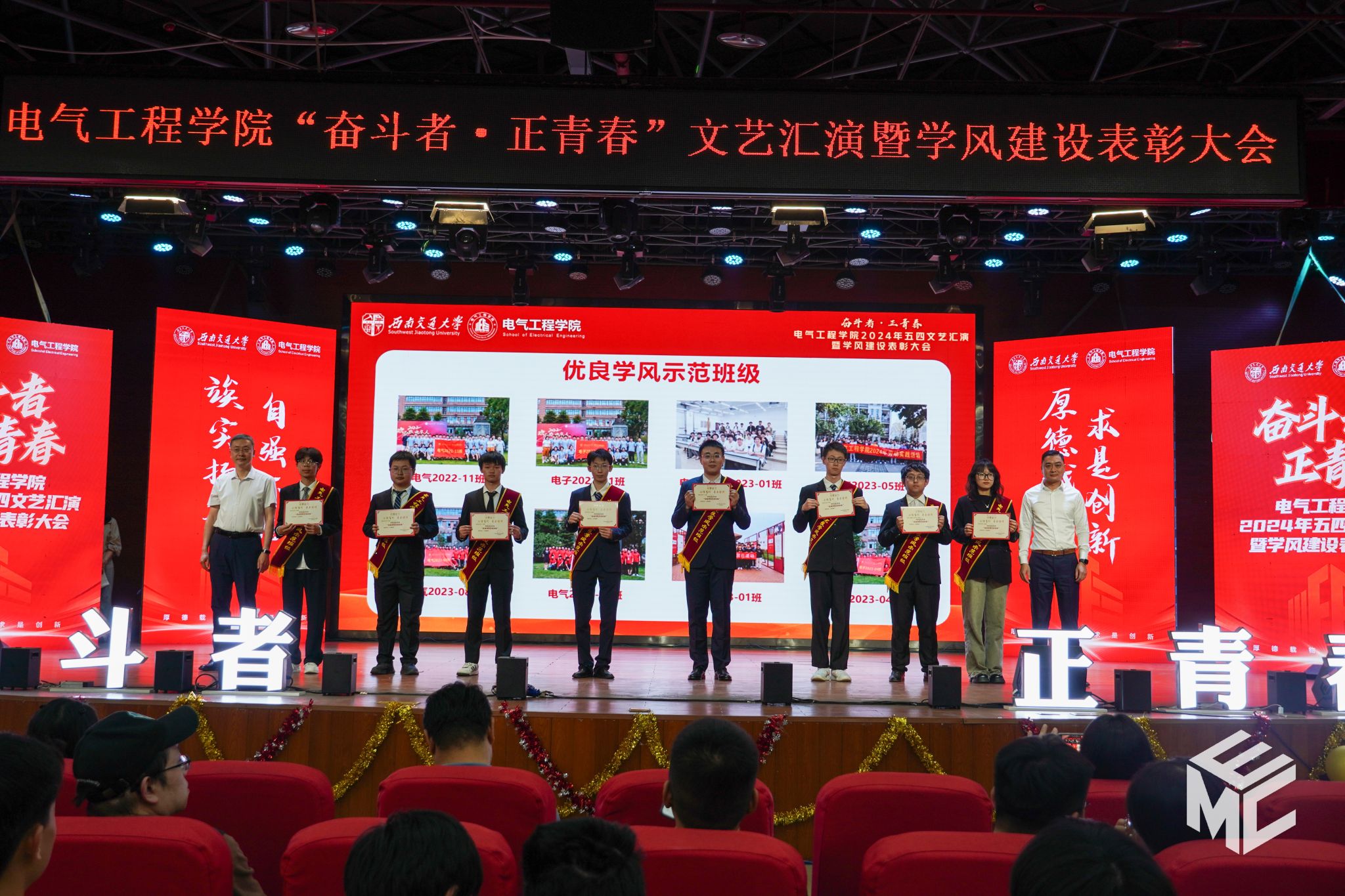 2024年4月27日晚,澳门十大电子正规游戏网站“奋斗者•正青春”2024年五四文艺汇演暨学风建设表彰大会在犀浦校区大学生活动中心如期举行。澳门十大电子正规游戏网站团委书记武俊,党委学生工作部副部长邢晓鹏,教务处副处长刘鎏,招生就业处对外联络科科长董鹏飞,澳门十大电子正规游戏网站党委书记王斌,副院长解绍锋,学院党委副书记谢力、王轶,信承瑞技术有限公司总裁金良赞,信承瑞周钗妹千万光彩基金会理事长林婷婷等出席晚会。2023级班导师及全体辅导员与同学们齐聚一堂,共同参加本次文艺汇演暨表彰大会。