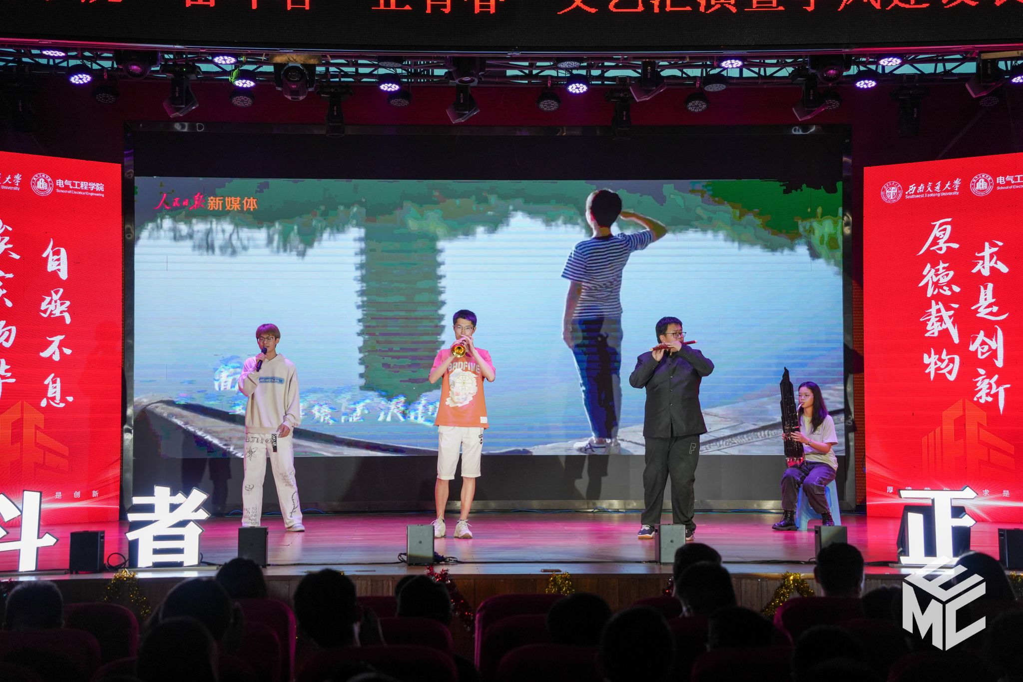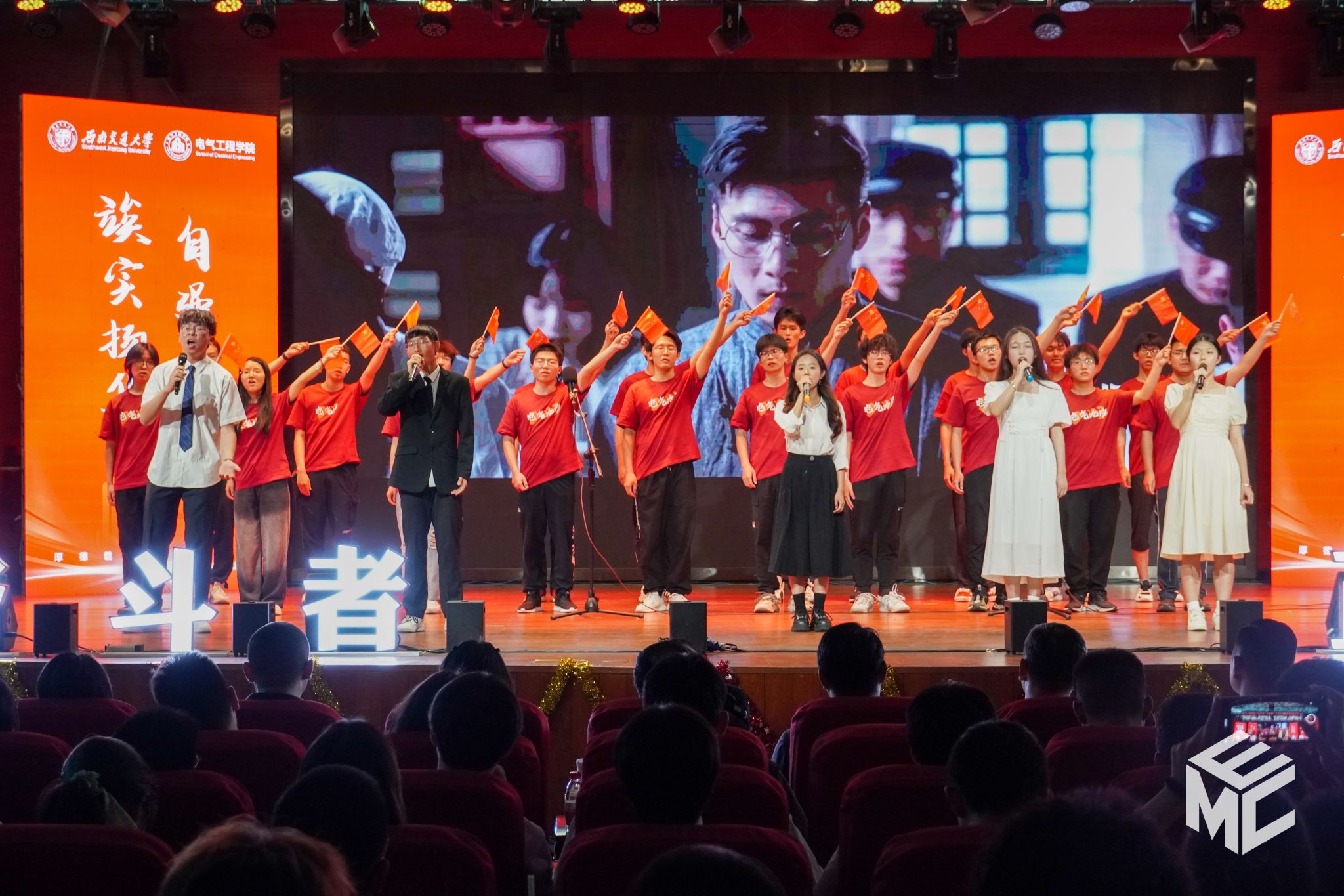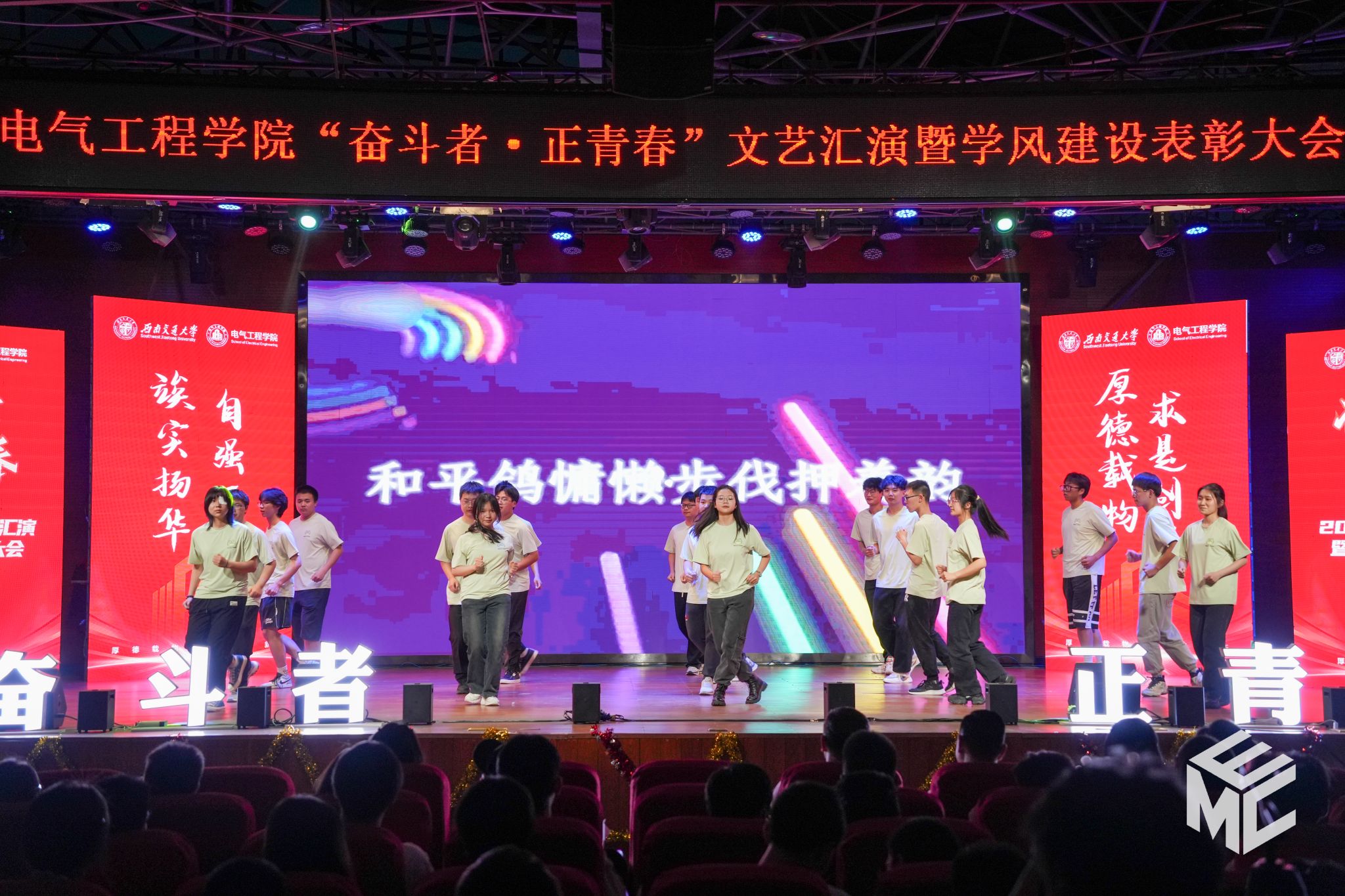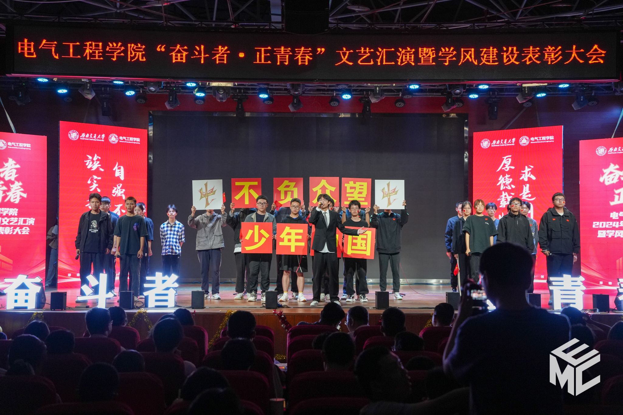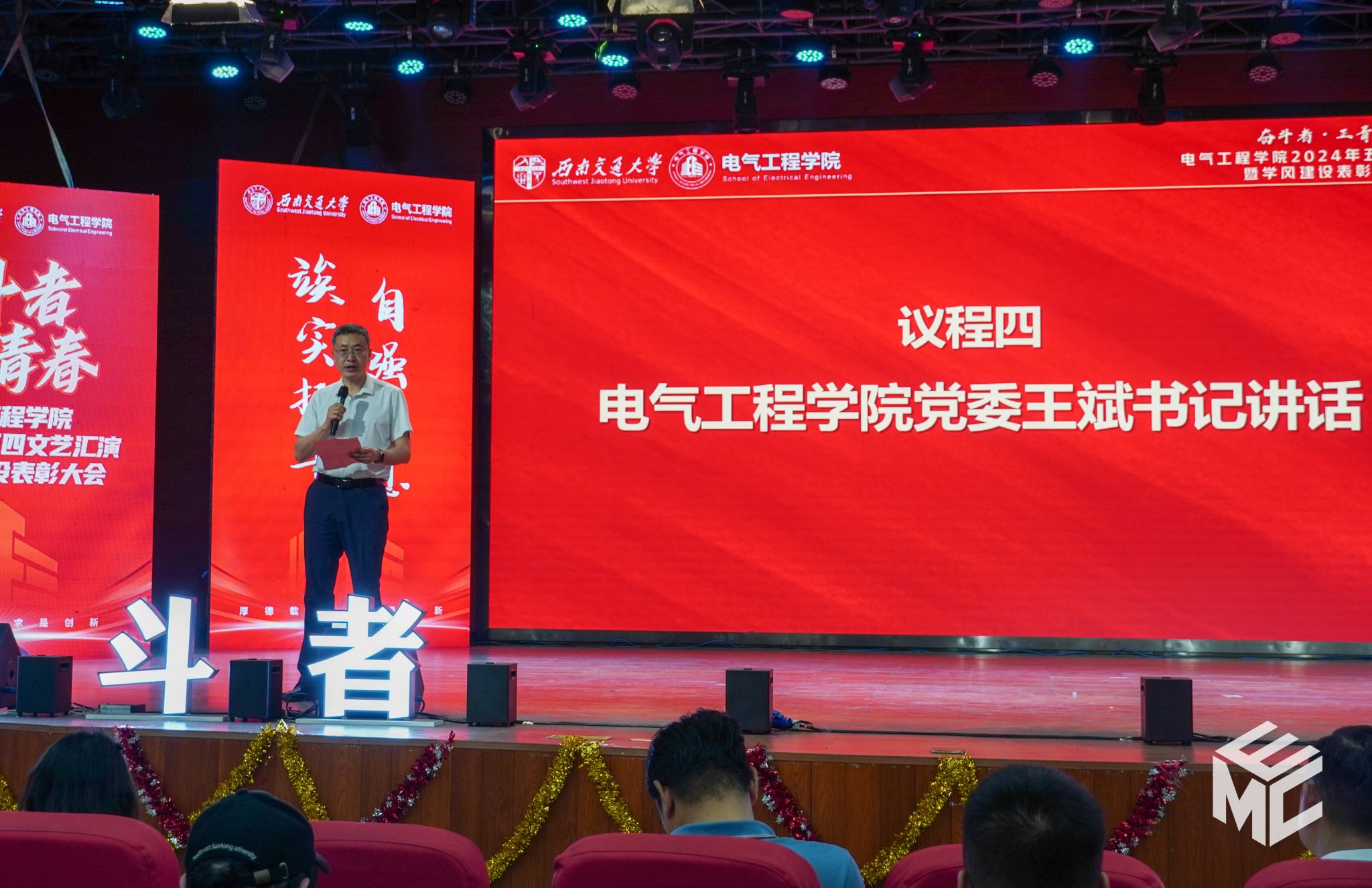 2024年4月27日晚,澳门十大电子正规游戏网站“奋斗者•正青春”2024年五四文艺汇演暨学风建设表彰大会在犀浦校区大学生活动中心如期举行。澳门十大电子正规游戏网站团委书记武俊,党委学生工作部副部长邢晓鹏,教务处副处长刘鎏,招生就业处对外联络科科长董鹏飞,澳门十大电子正规游戏网站党委书记王斌,副院长解绍锋,学院党委副书记谢力、王轶,信承瑞技术有限公司总裁金良赞,信承瑞周钗妹千万光彩基金会理事长林婷婷等出席晚会。2023级班导师及全体辅导员与同学们齐聚一堂,共同参加本次文艺汇演暨表彰大会。