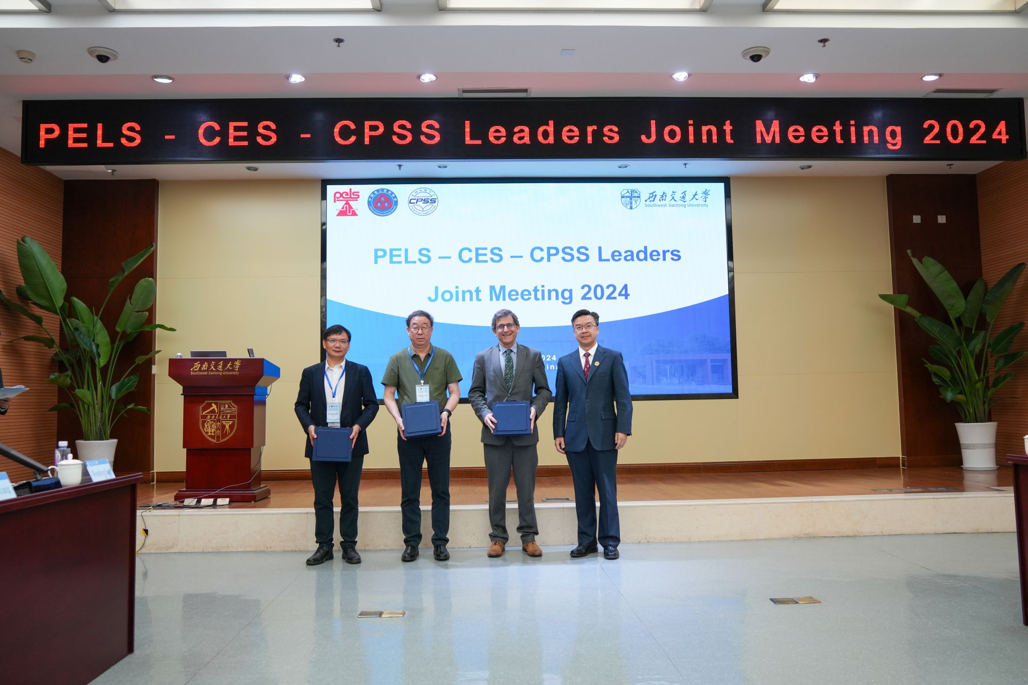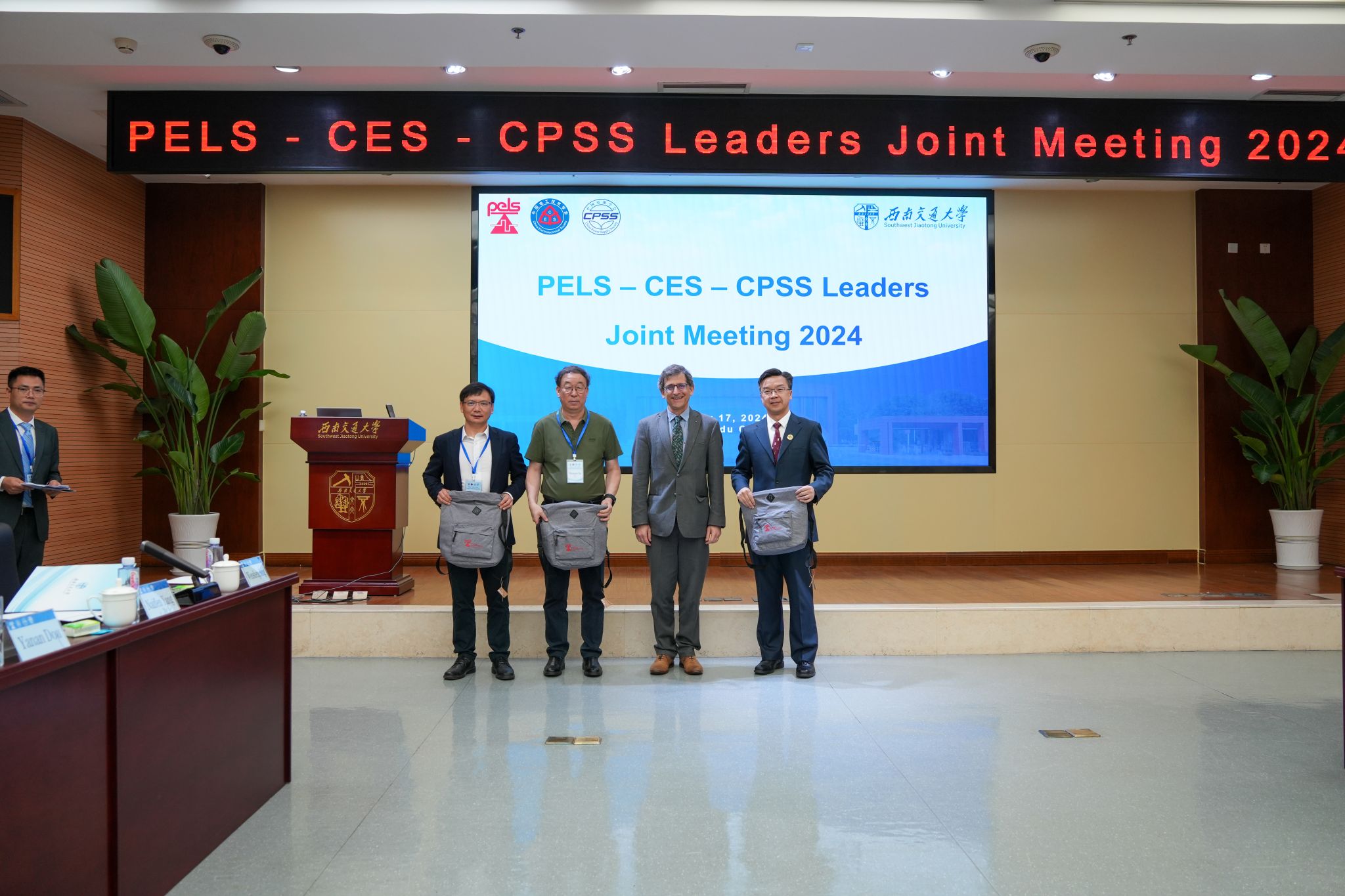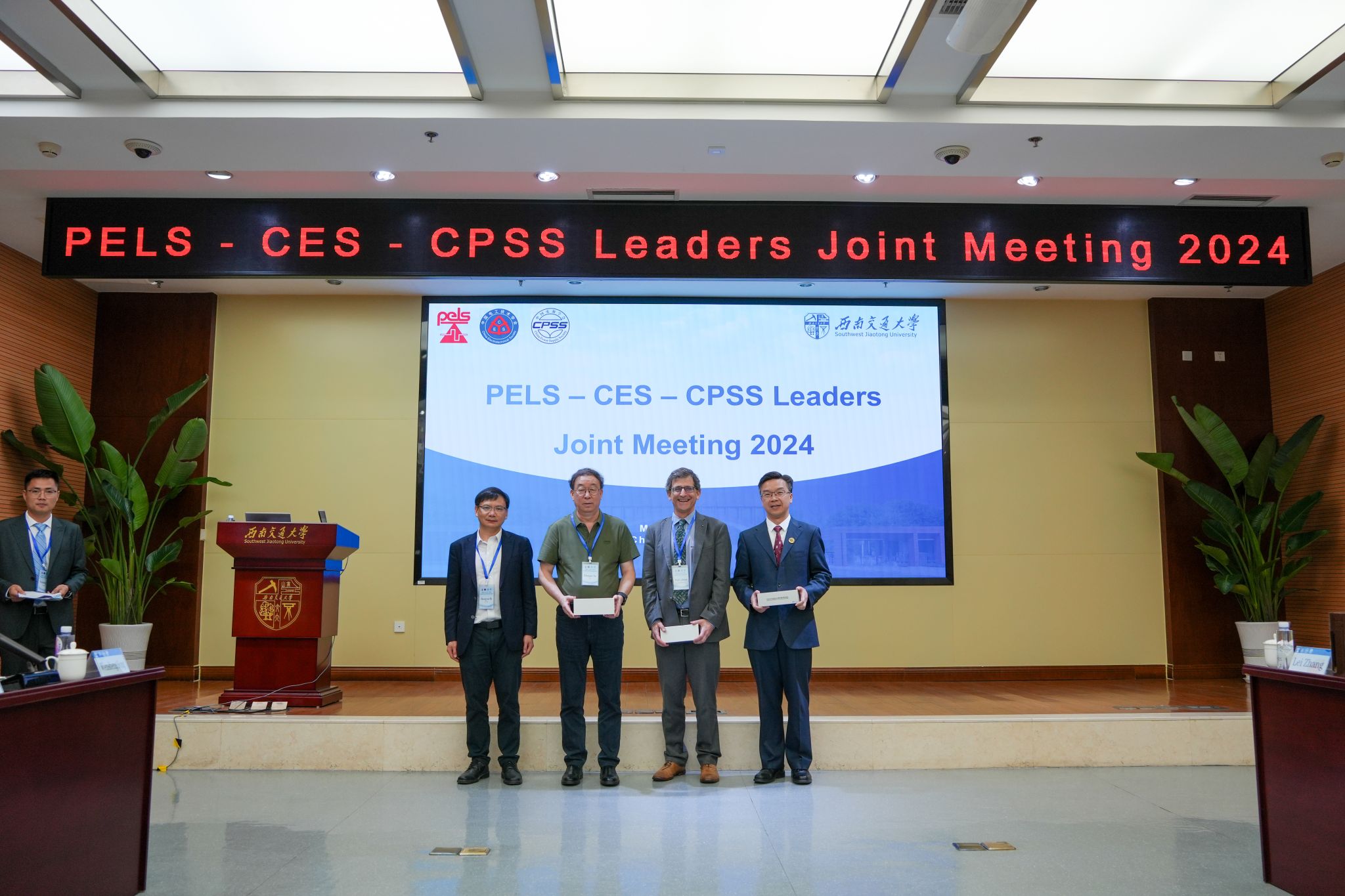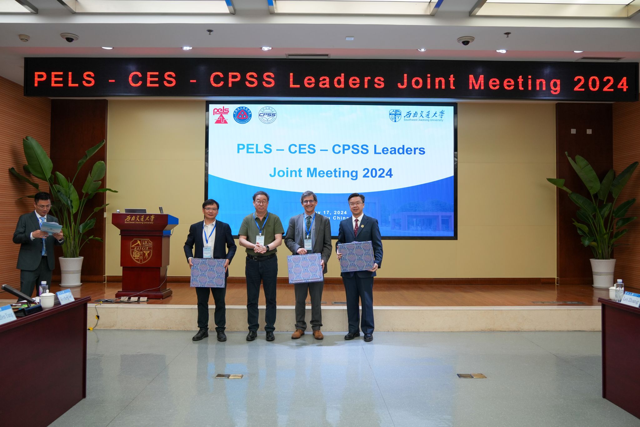 随后,何正友副校长与IEEE PELS主席Brad Lehman,CES副理事长徐殿国,CPSS理事长刘进军互换礼品,表达对未来在学术交流、科技创新等方面进一步深入合作的期待。