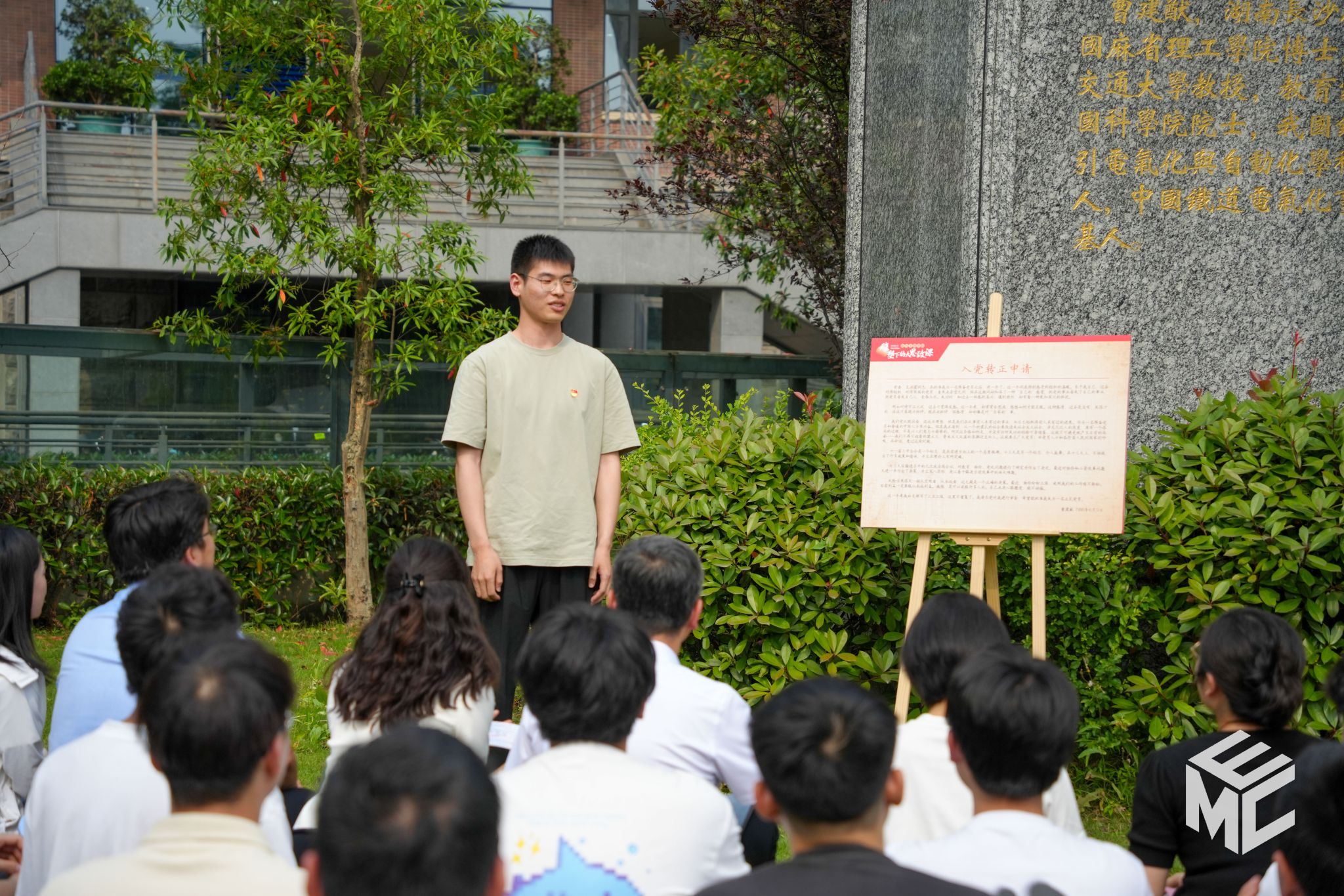在场师生无不为曹老的精神所折服,青年教师代表韩莹分享了自己参与“曹建猷院士学术成长资料采集工程”的经历,展示了曹老手写教材《电力铁道一次供电系统》《Theory of Computation》复印版,将自己在曹老身上感受到的精神鼓舞转化成教书育人的动力源泉,做到“一棵树摇动另一棵树”。博士生党支部书记代表王顺同志领学曹建猷院士的入党转正申请,全体师生集体诵读《中国共产党纪律处分条例(节选)》。声声诵读环绕在曹老雕塑前,更深入在场每一位青年师生心间。