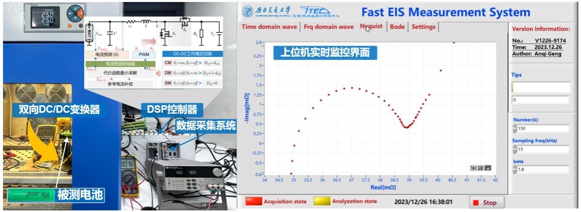 此外,在四川省重大项目的资助下,团队拓展了宽频带阻抗测量技术在锂电池EIS快速测量方面的应用研究。团队所研制的测量系统通过双向DC/DC变换器向被测锂电池注入宽频扰动,该系统仅需要一个扰动周期(10s)即可获得0.1Hz-2kHz的宽频阻抗,相关研究成果已发表在IEEE TIE/TTE等国际顶级期刊上。同时,在企业项目支持下,团队已开展了将锂电池电化学阻抗谱快速测量技术嵌入电动汽车充电桩、储能电站PCS等方面的研究。