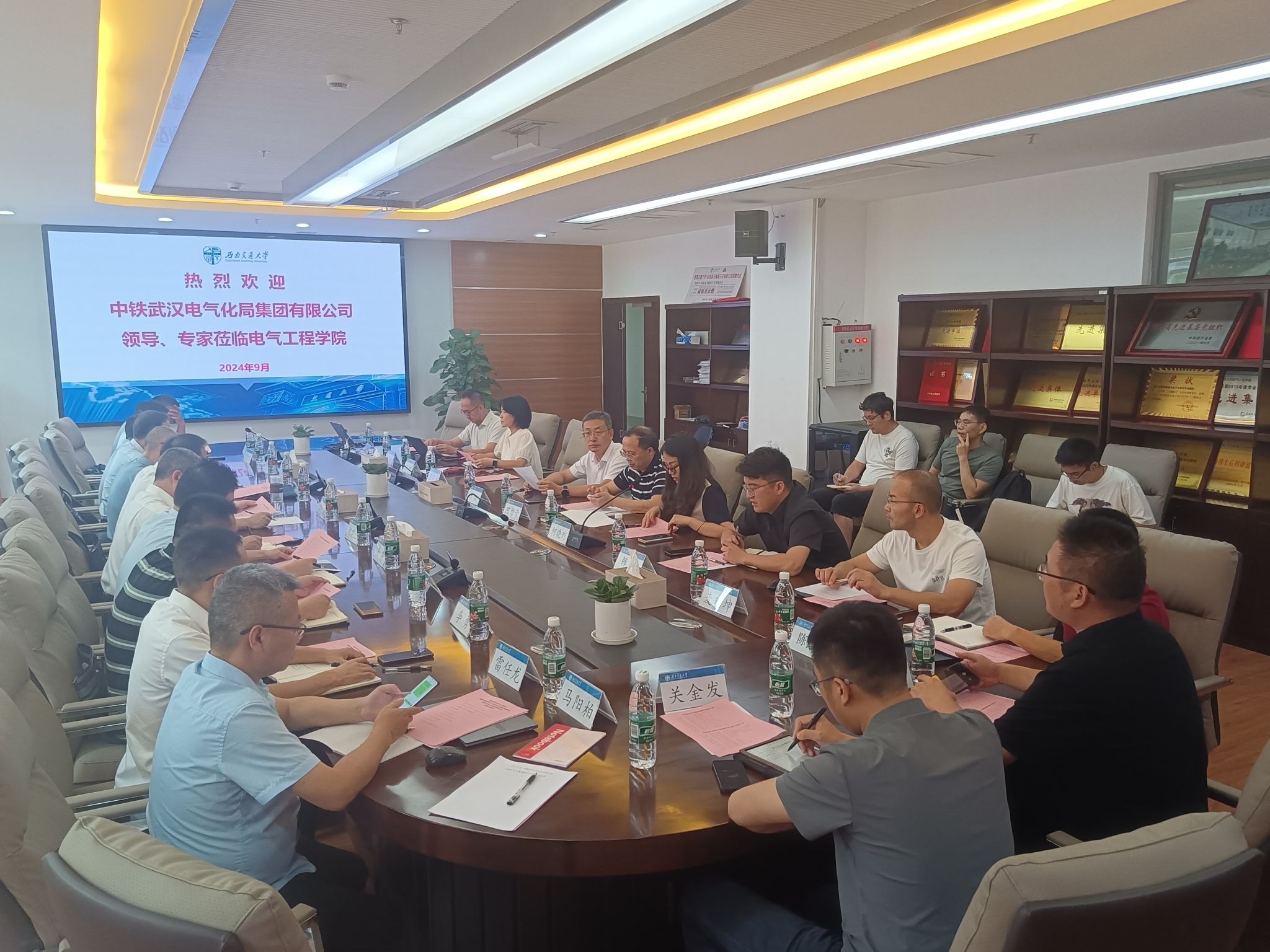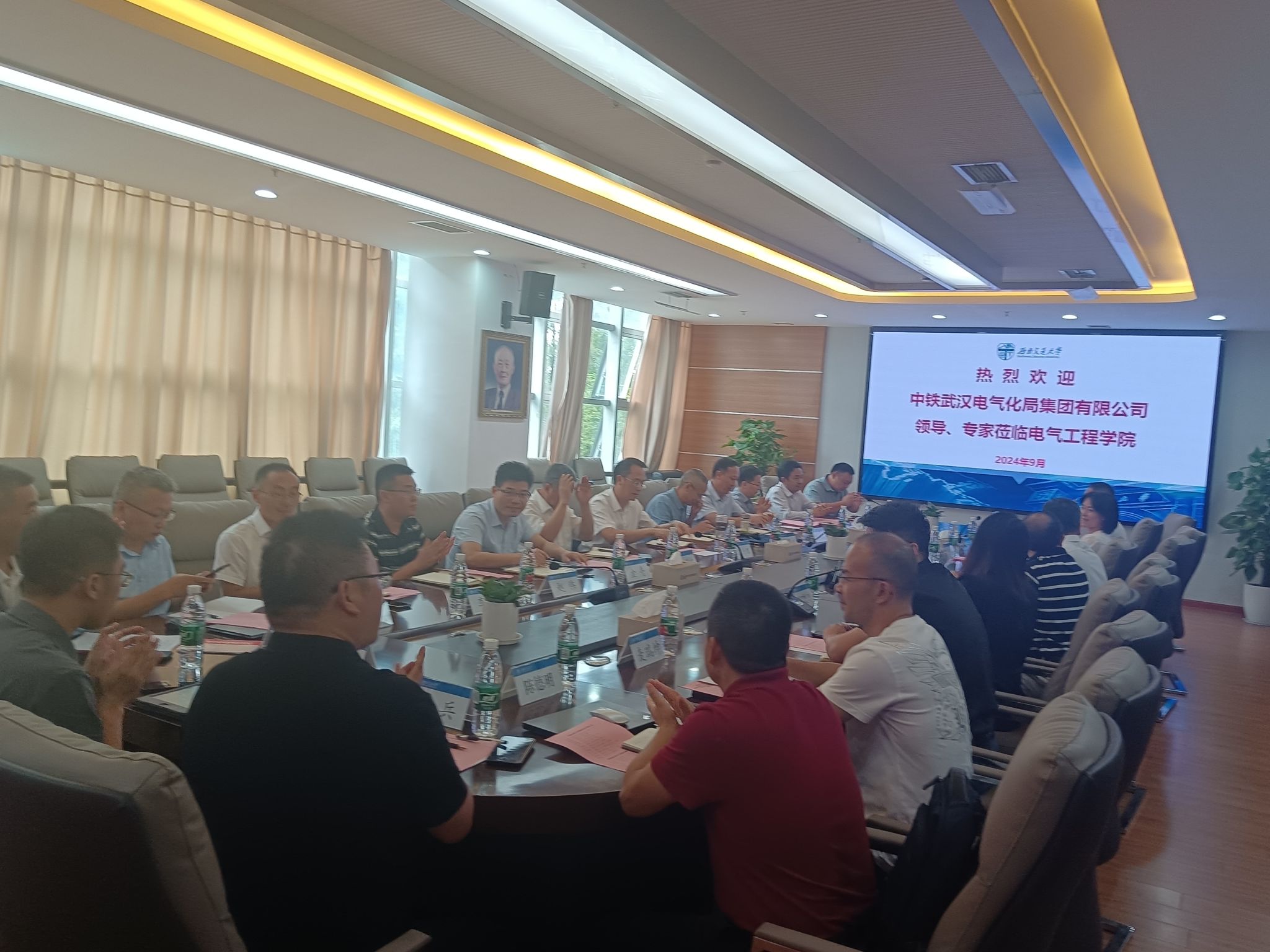 2024年9月24日,中铁武汉电气化局领导莅临澳门十大电子正规游戏网站进行交流研讨。中铁武汉电气化局集团公司副总经理、总工程师冯小鹏,副总工程师沈曼盛,高级专家祝晓红,科技信息化部部长胡安富,工程部部长金舟,设计研究院院长李顺成,集团公司二公司总工程师赵伟,设计研究院总工程师刘冰瑞等相关领导;澳门十大电子正规游戏网站党委书记王斌、氢能及储能技术研究院院长陈维荣、澳门十大电子正规游戏网站继续教育学院院长陈民武、澳门十大电子正规游戏网站党委副书记、副院长、纪委书记王轶,澳门十大电子正规游戏网站副院长/国家轨道交通电气化与自动化工程技术研究中心副主任何晓琼,澳门十大电子正规游戏网站院长助理韩莹,国家轨道交通电气化与自动化工程技术研究中心副主任麦瑞坤,智能牵引供电铁路行业重点实验室主要负责人于龙,澳门十大电子正规游戏网站教师代表以及学生代表参与研讨交流。会议在犀浦校区X10212举行,何晓琼副院长主持会议。