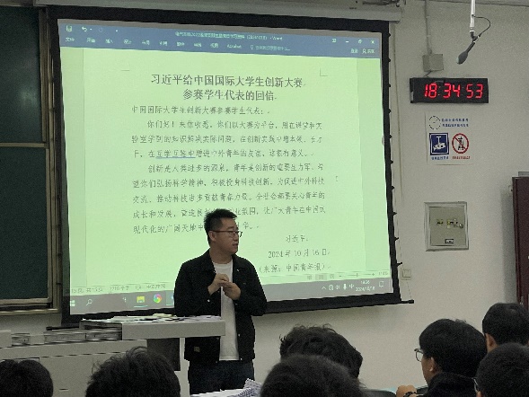 本科2021、2022级党支部于10月18日联合开展主题党日。学院学生党建工作负责人孙海洋老师领学习近平总书记在全国教育大会上的重要讲话精神,学院学生科创工作负责人谢东旭老师领学《习近平给中国国际大学生创新大赛参赛学生代表的回信》。与会学生党员备受鼓舞,积极分享自己的学习心得和体会,纷纷表示要将习近平总书记的重要讲话和回信精神内化于心、外化于行,立报国强国大志向,做挺膺担当奋斗者。