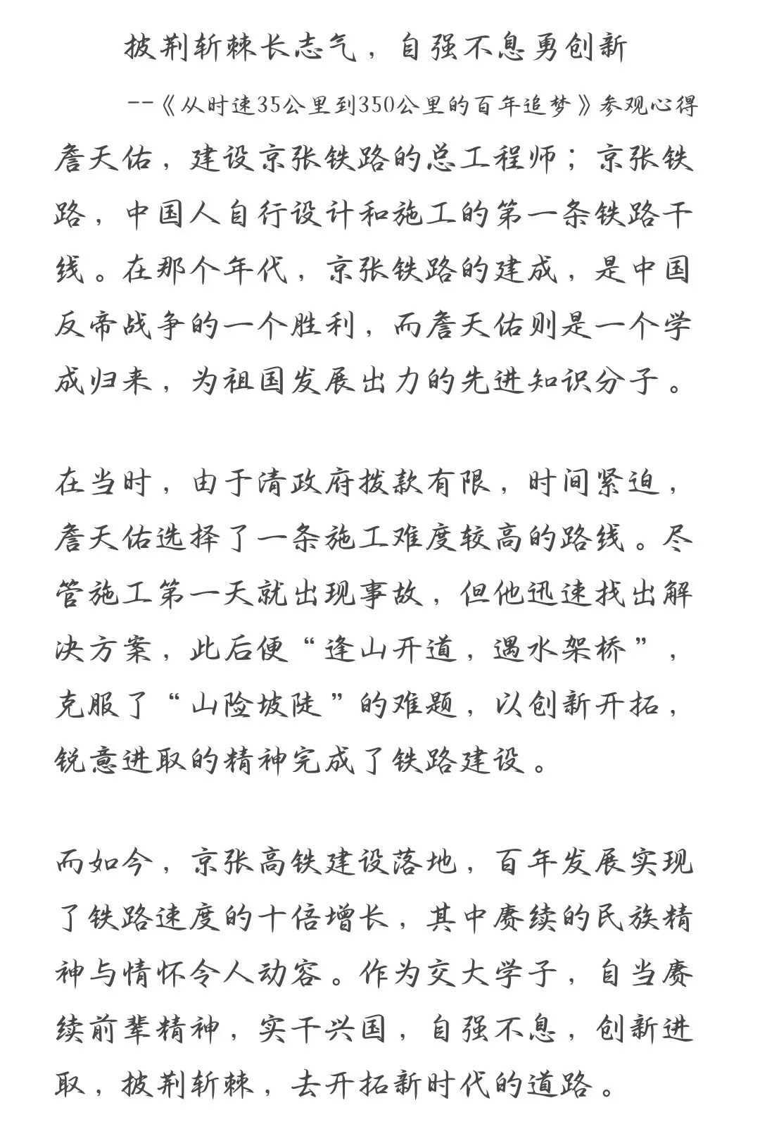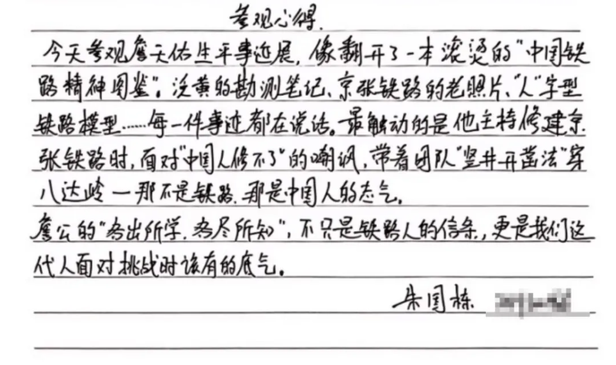 参观詹天佑生平事迹展,我深受震撼。詹天佑在艰难时局下,以坚毅决心和卓越智慧建成京张铁路,打破了外国人的质疑。从时速 35 公里到 350 公里的跨越,是一代代铁路人传承詹天佑精神、不懈奋斗的成果。作为电气工程专业学子,我定以先辈为榜样,在专业领域深耕,用知识与汗水为我国电气事业发展添砖加瓦。